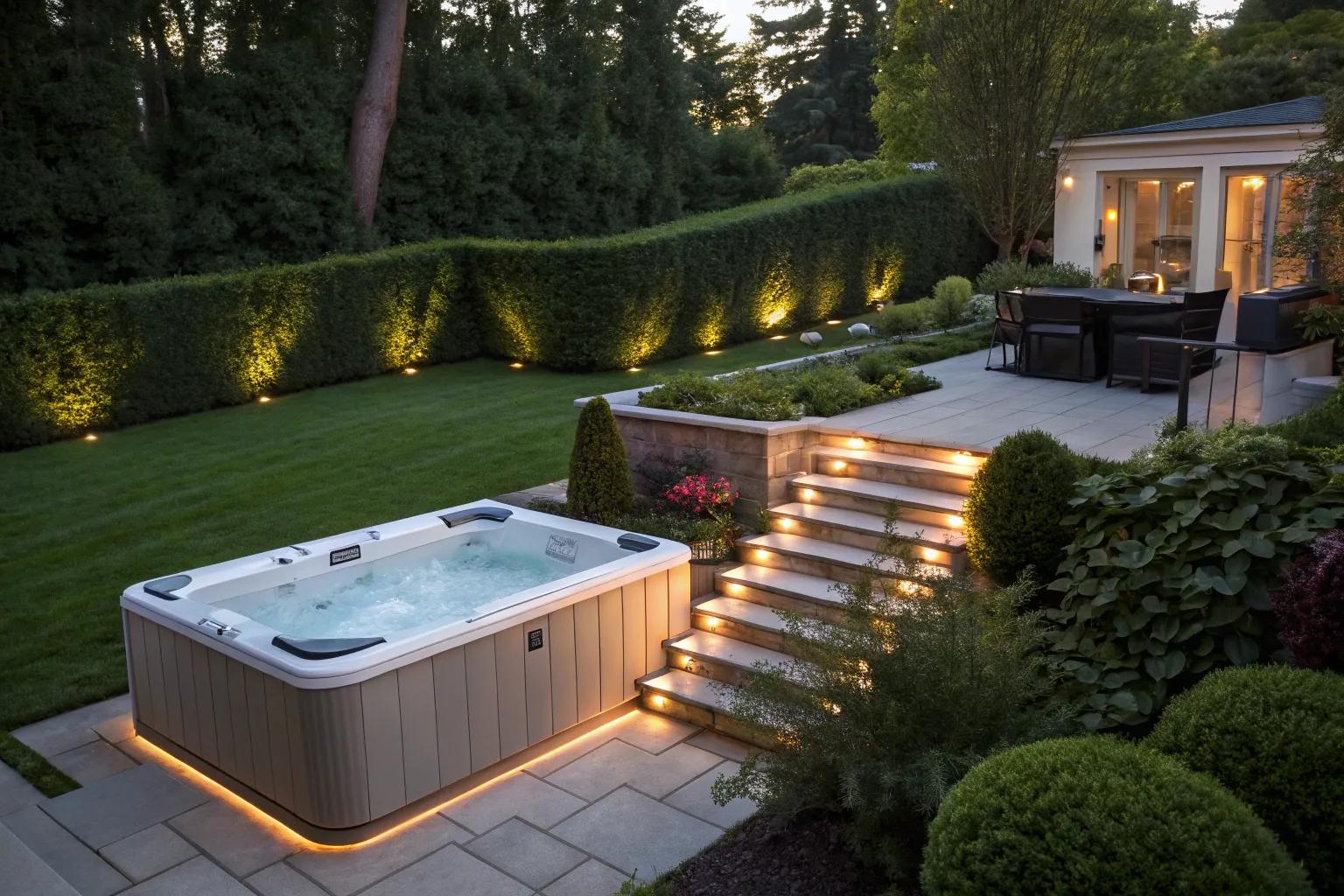 Brighten your nighttime soaks by integrating LED lighting into your hot tub steps. The gentle illumination not only fosters a relaxing mood but also reduces the risk of slips and falls.