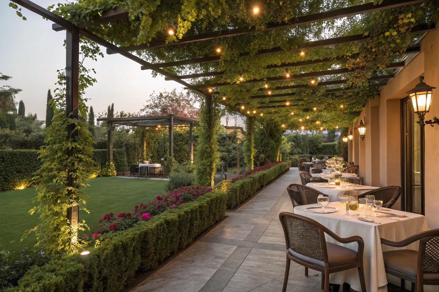 Experiment with multiple levels in your pergola design to add depth and interest. This architectural feature can define different zones and create a dynamic dining experience.