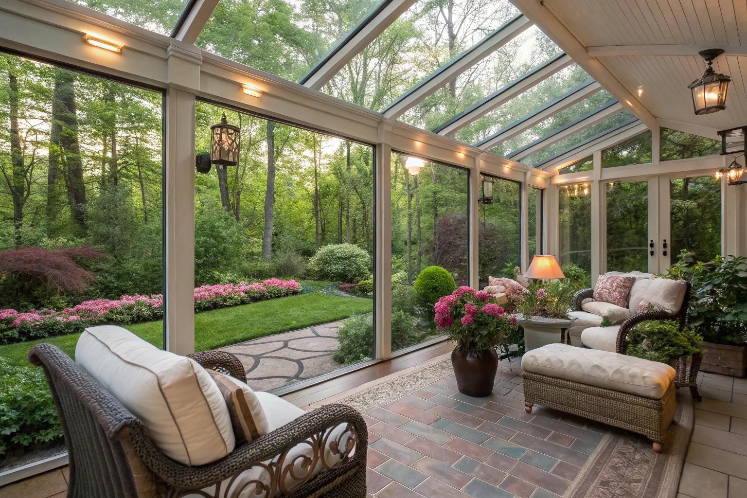 Fill your glass porch with lush greenery to create an indoor garden oasis. I love using hanging plants and small potted trees to bring nature right to my doorstep.