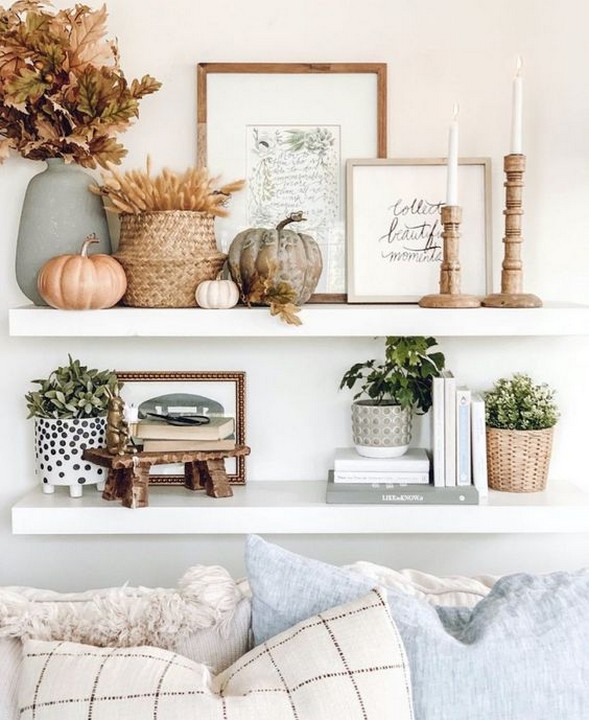 Bring autumn indoors by staging decorative collections of gourds, pine cones, colorful leaves, and miniature pumpkins. These natural decorations work well as statement centerpieces or subtle accents on shelves and mantels.