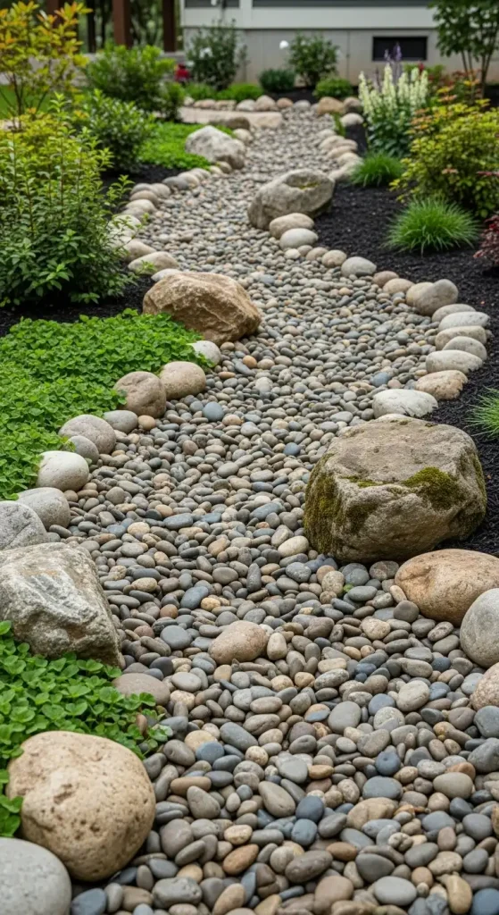 A dry riverbed is an excellent solution for water runoff in a creative way.