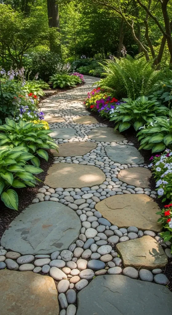 You can create a durable and beautiful path by combining large, flat stepping stones with smaller river rocks.