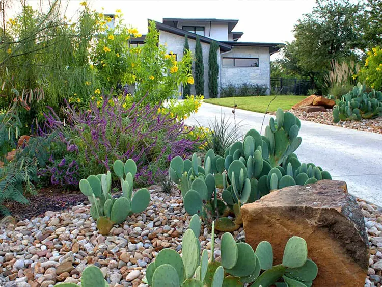 Prickly pear takes center stage here, surrounded by river rock and a massive natural boulder. There’s purple salvia blooming in the background.