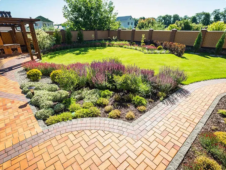 Those pavers give the yard definition, and the planting beds follow the natural slope. It’s structured but still feels organic.