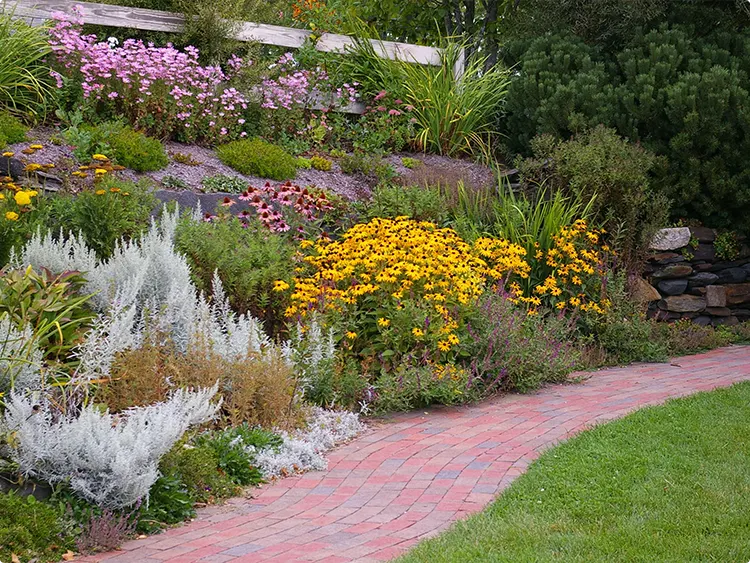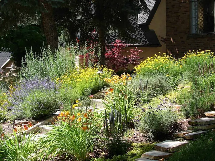 The irregular flagstone path winds through beds of native grasses and blooming plants. Pink flowers peek out along the edges.