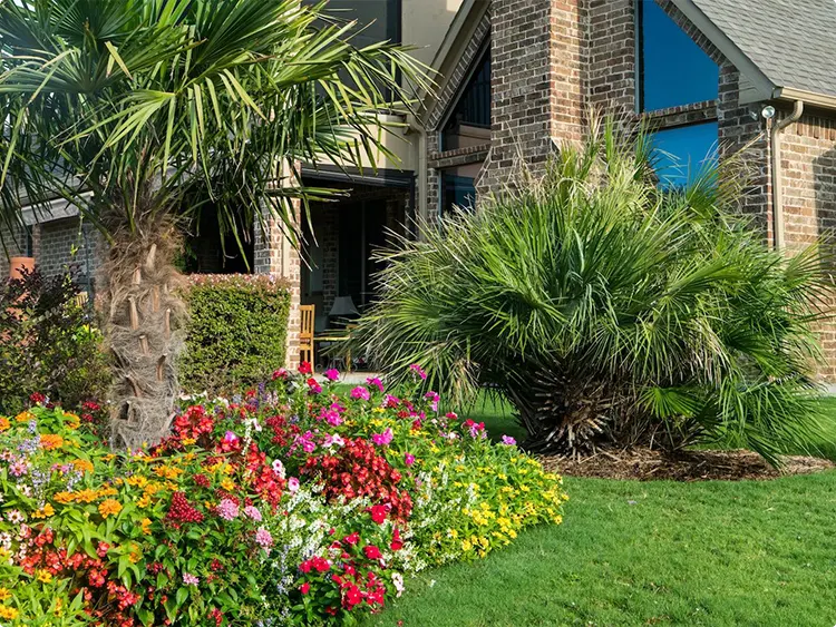 The ponytail palm adds height, and the flower beds are packed with color. It’s formal but not stuffy.