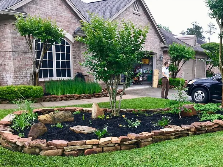 The stacked stone border creates a raised bed with dark mulch. A few small trees and plants are just getting established.