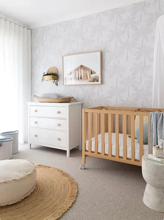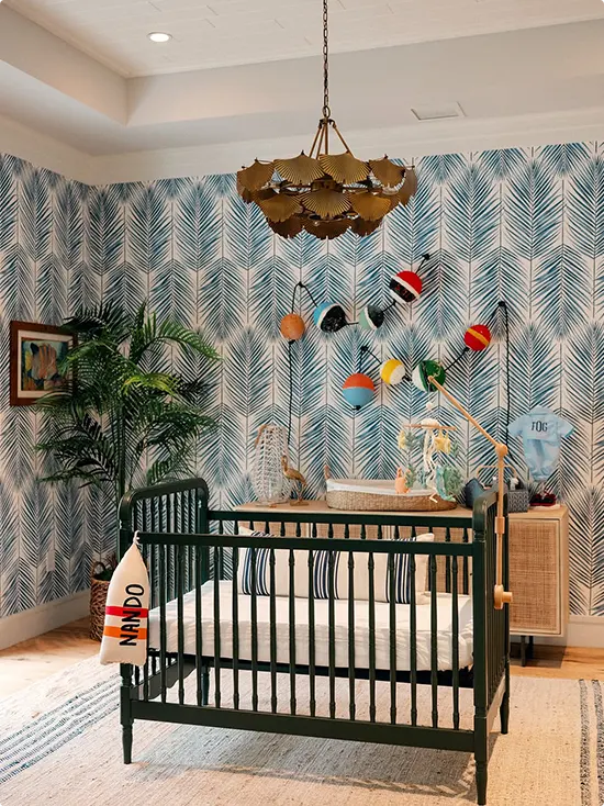 The palm leaf wallpaper introduces a subtle tropical flair, adding visual interest without overwhelming the room. A natural wood crib brings warmth, while a round jute rug grounds the space, creating a fresh and inviting coastal retreat.