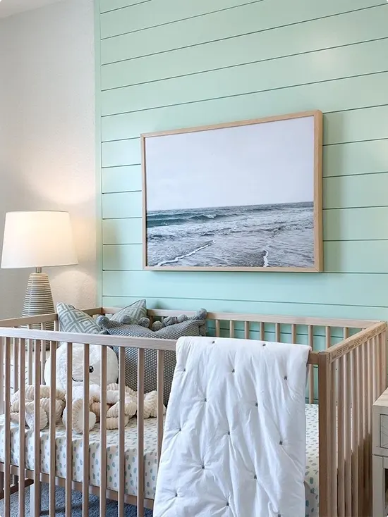 The pale green shiplap wall introduces a modern coastal vibe that feels fresh and understated. A framed ocean photograph above the crib evokes a peaceful horizon, blending contemporary style with timeless coastal charm.