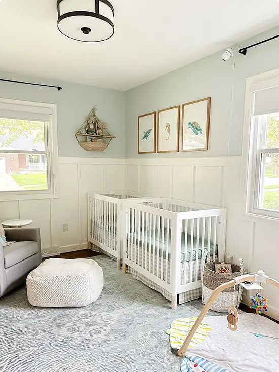 Soft blue walls create an open, airy atmosphere, while framed marine life prints add a playful yet sophisticated touch. White wainscoting provides structure and balance, making this nursery both cheerful and calming.