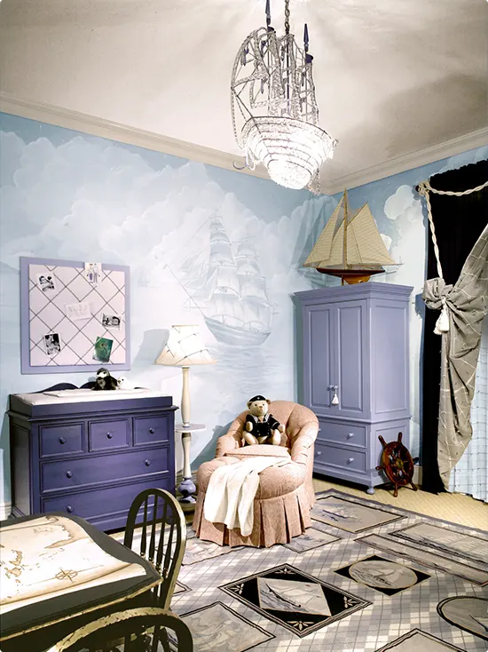 This nursery tells a story with ship murals, nautical furnishings, and layered textures that feel enchanting. Despite the rich details, the soft color palette and balanced layout keep the space from feeling overwhelming, offering a whimsical coastal retreat.