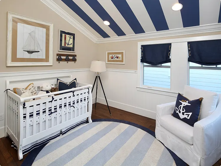 The striped ceiling adds a bold nautical element without cluttering the walls. Combined with anchor motifs, soft blues, and crisp white furniture, this nursery feels timeless, playful, and thoughtfully designed.