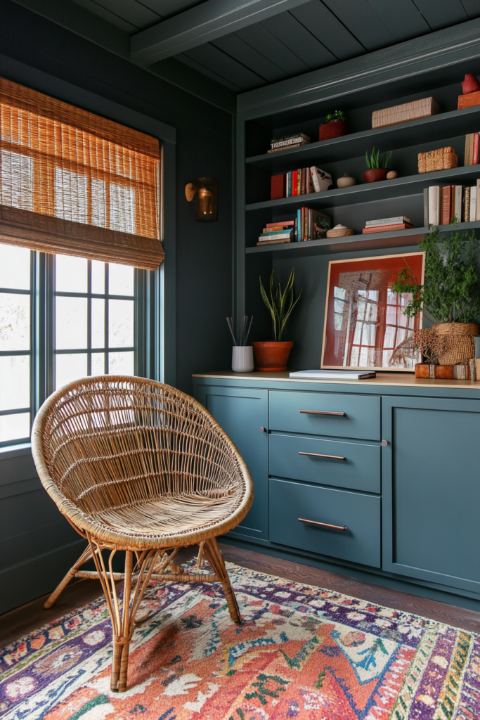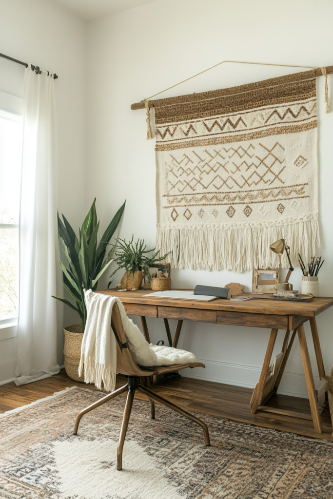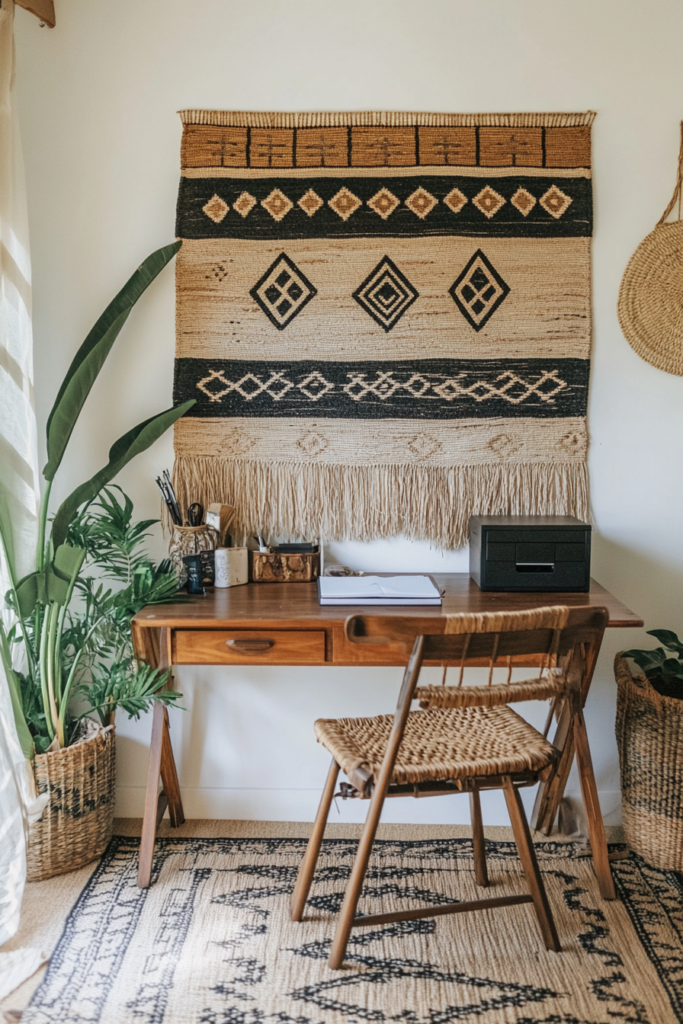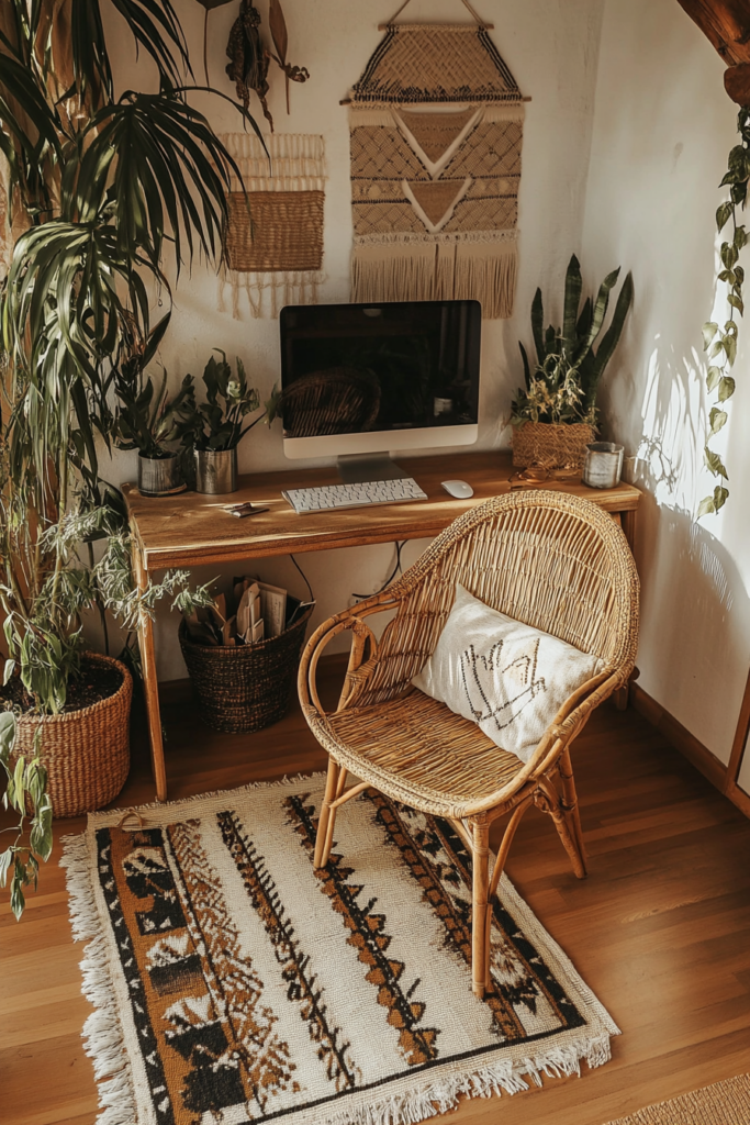 Opt for wooden desks, rattan chairs, or vintage pieces to bring natural warmth to the room. Look for ergonomic seating with boho cushions or throws for added comfort and style. Mix and match textures to keep the furniture eclectic but functional.