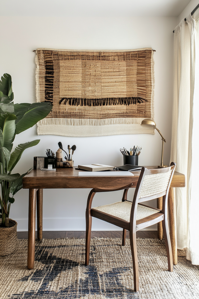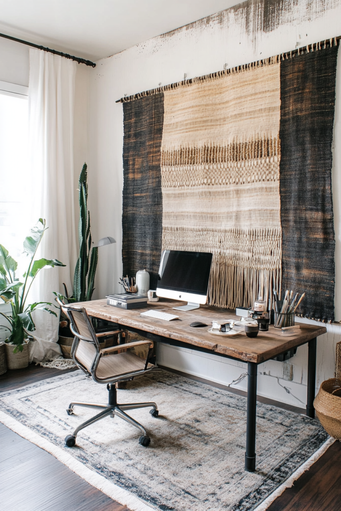 A handwoven backdrop can bring a warm touch to your office. Choose colors that match your style to create a calming vibe.