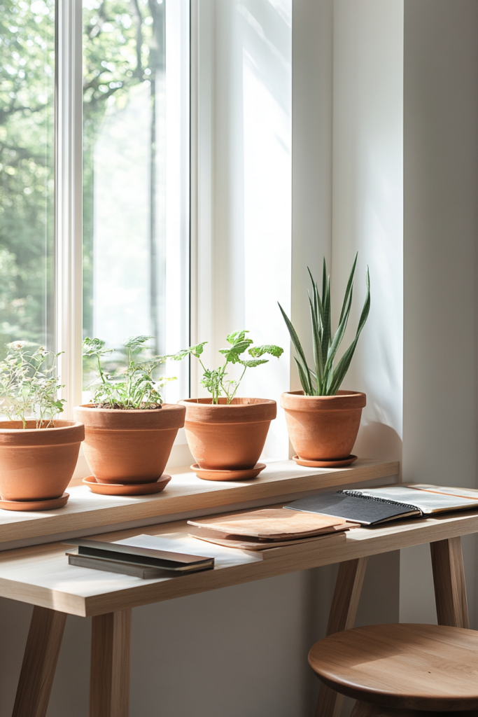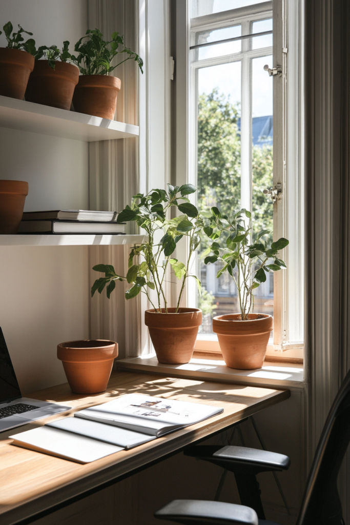 Terracotta pots add a warm and earthy touch to your office. They are perfect for holding plants like succulents or small flowering plants.