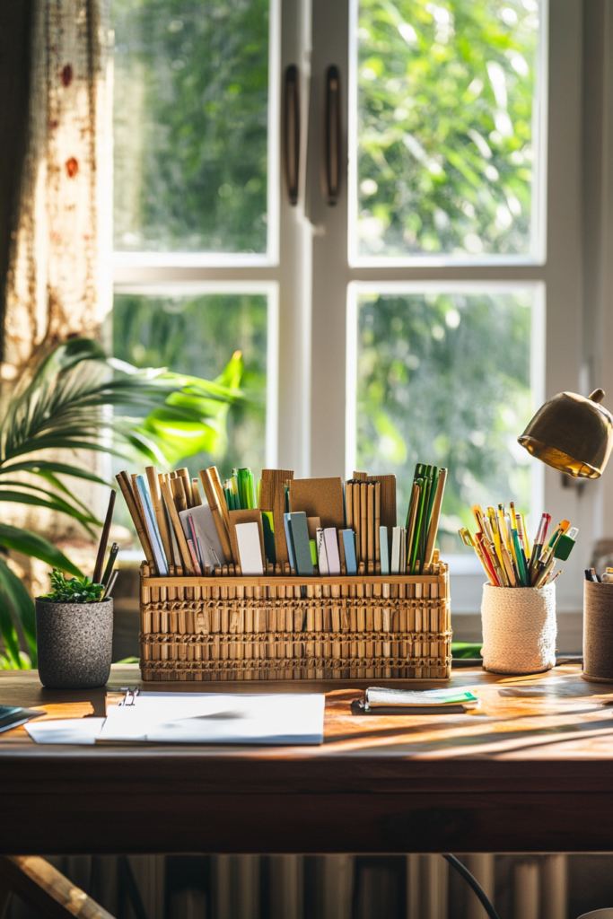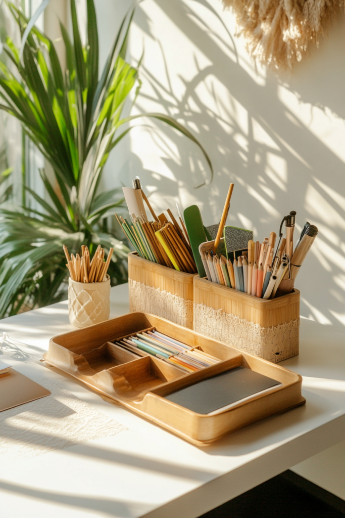 A bamboo stationery organizer adds a natural touch to your office. It helps keep your pens, paper clips, and notepads in order. The smooth finish of bamboo brings a calming vibe to your workspace.