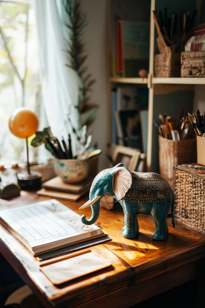 A ceramic elephant figurine adds a unique charm to your office. This piece can serve as a conversation starter and bring a touch of whimsy to your workspace.