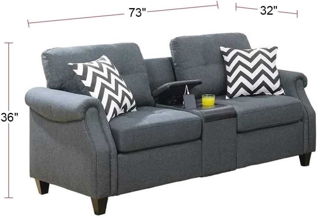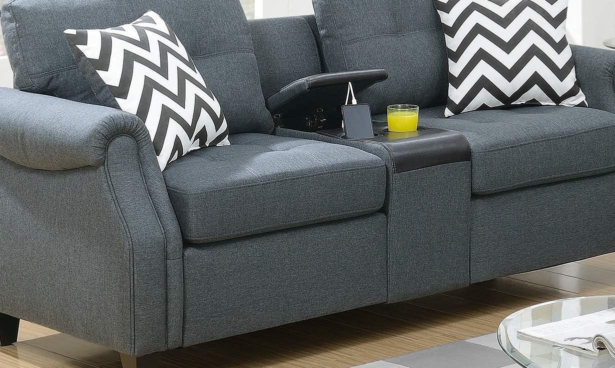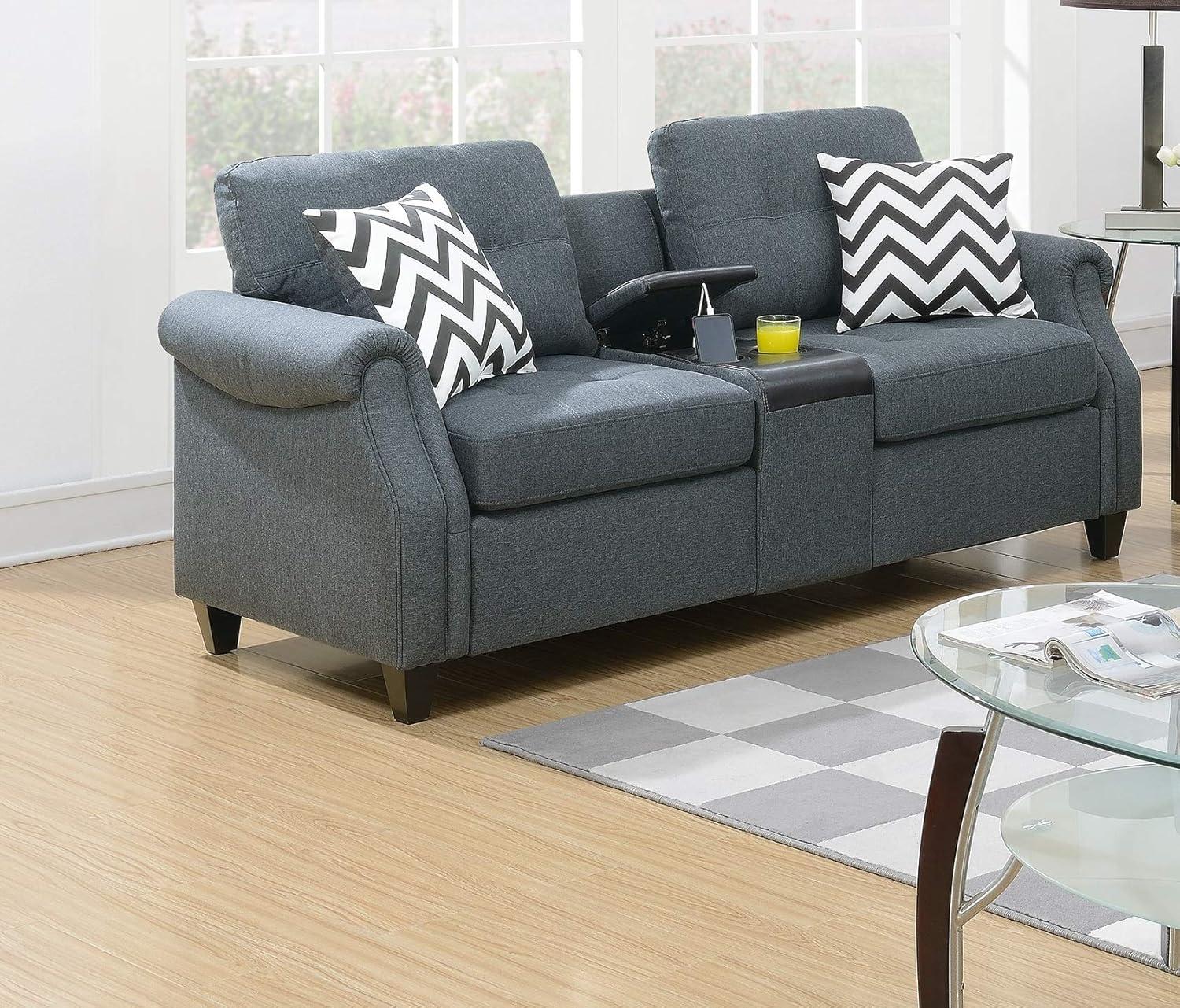 After some weeks with it you notice the 2pcs Plush Polyfiber Sofa Set with 3-Seat Sofa and Loveseat with USB Console & Cup Holders, Modern Living Room Furniture with 2 Vibrant Pattern Pillows, Blue-Gray simply settles into the rhythm of the room rather than announcing itself. As the room is used it quietly reshapes traffic and seating — the loveseat nudged toward the window, the three-seat holding late-night reading sessions; cushions soften into habitual dips while other spots stay firmer, and surface wear reads more like a faint patina than anything abrupt.In daily routines the console and cup holders mark small pauses, the patterned pillows gather crumbs and stray hairs, all those little traces that make it part of everyday presence. It becomes part of the room.