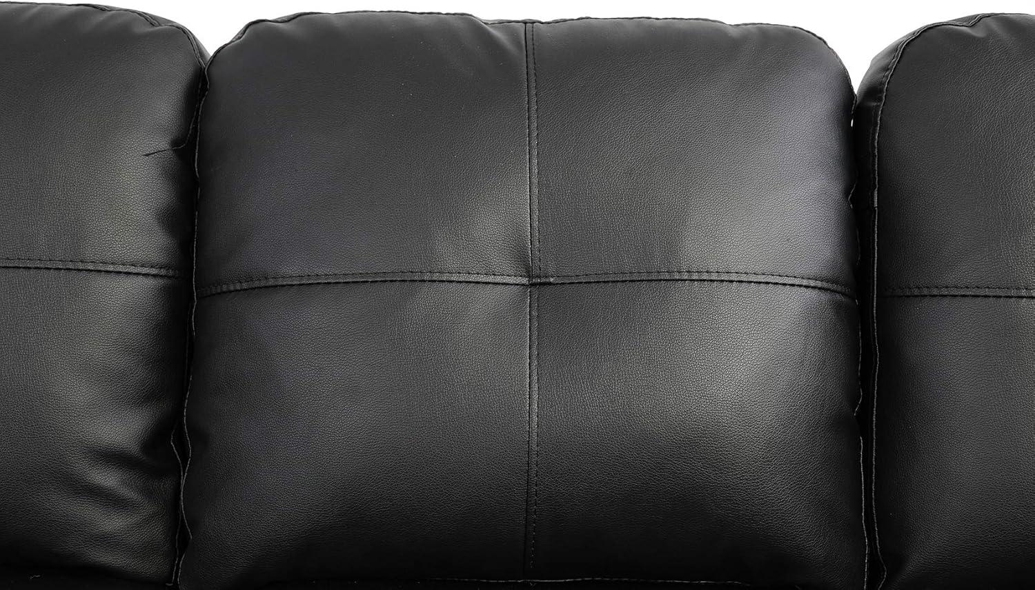 when you first see the set in place, the overall silhouette reads compact and deliberate: the seating line drops low, the back cushions sit slightly proud of the frame, and the long section runs to your right as you face it. The black upholstery eats some light,so textures—tiny nap,stitch lines,any slight sheen—are more noticeable where lamps hit the arms or the ottoman top. Cushions show soft creasing where hands or hips meet them; you might find yourself smoothing the seat fronts or nudging a seam back into line without thinking about it.