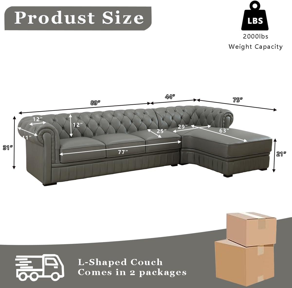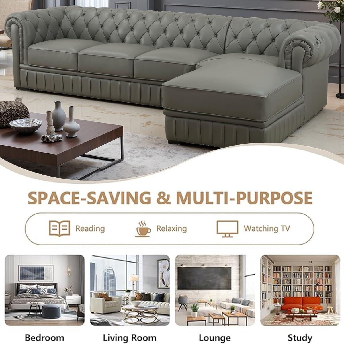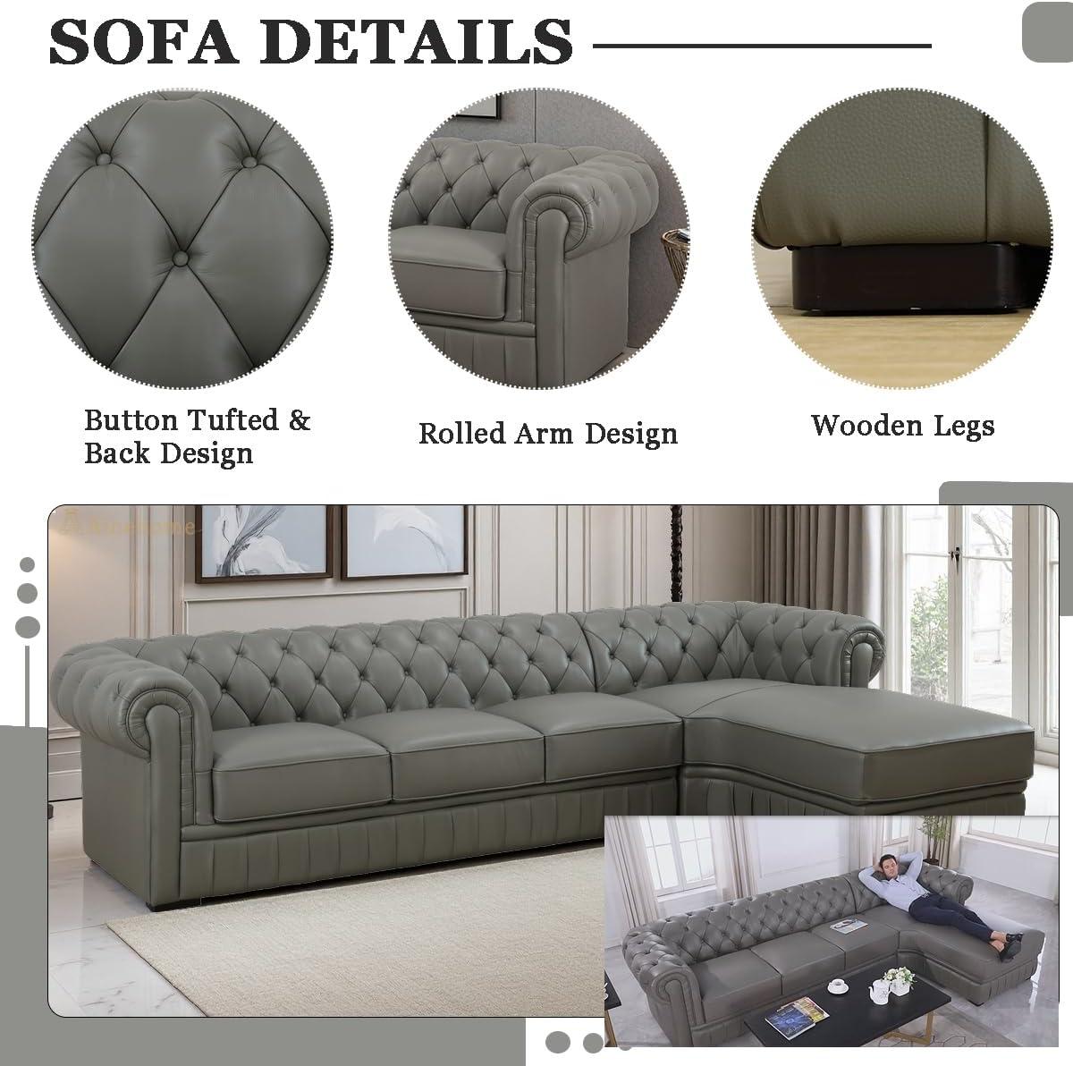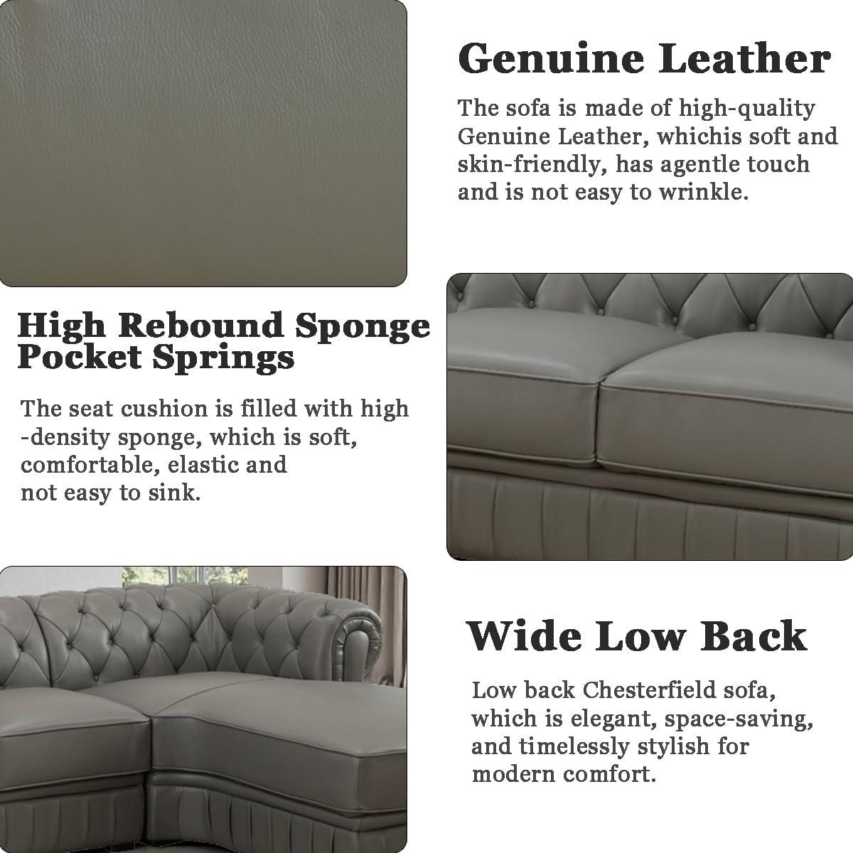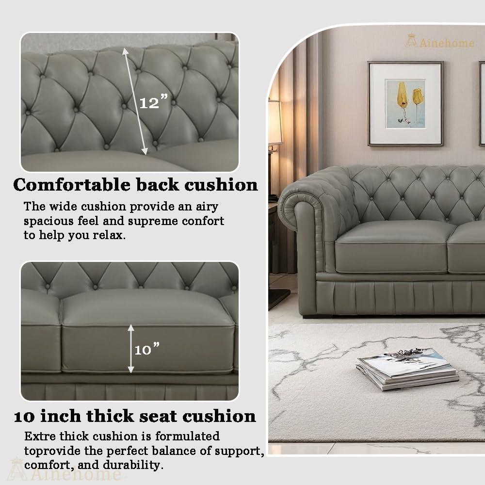 You sweep your hand across the gray cowhide and feel it cool and smooth, taking a faint thumbprint that settles almost promptly. You notice the A Ainehome Genuine Leather Sectional Sofa Couch — the Ainehome Chesterfield, for short — unfolding as a low, L-shaped presence with deep button tufting and rolled arms. its long run of seating carries real visual weight: the tufted dimples throw small shadows were light lands and the silhouette quietly orders the room. Sit down and the cushions push back with a springy, supportive give, while the grain of the hide reads tactile and slightly cool under your palm. Up close, the leather’s muted sheen and neat seams feel lived-in rather than glossy, leaving a significant, everyday-first impression.