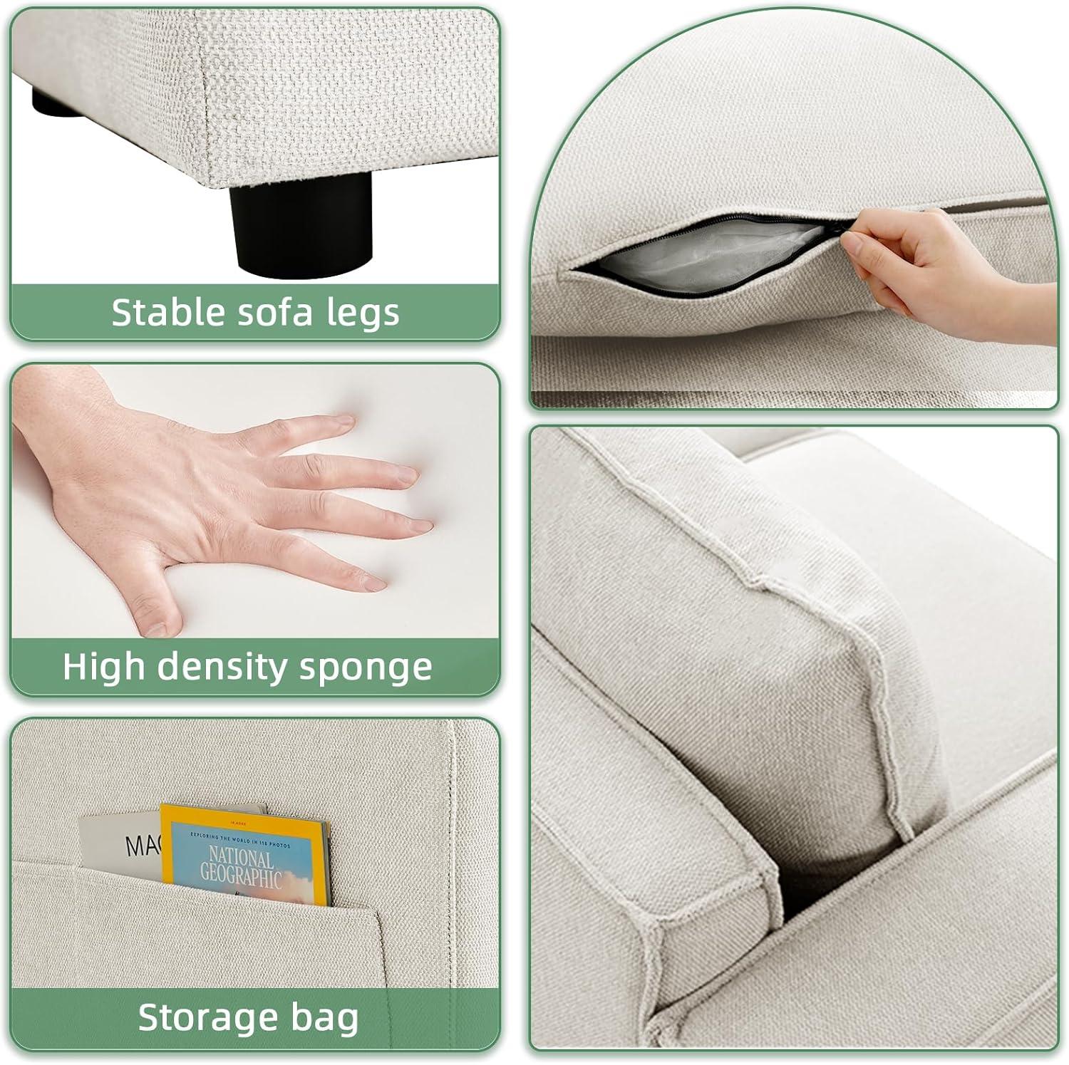 Integrated Storage: The ottoman hides a spacious compartment perfect for blankets, toys, or magazines, helping keep your space tidy. Comfortable & Supportive: Thick cushions with high-resilience foam and S-shaped springs provide excellent ergonomic support, reducing pressure on your back and knees. Durable Linen Fabric: Stain-resistant, anti-pilling linen upholstery that’s pet-friendly and breathable, suitable for all seasons. Removable & Washable Covers: Cleanup is simple and convenient, ideal for those who prioritize hygiene. Robust Build: Solid metal and wood frame able to hold up to 330 lbs per seat – durable enough for everyday living and playful moments. Easy Assembly: Clear instructions and no extra tools needed – assembly takes about 30 minutes with two people. Floor Friendly: Equipped with foot pads to protect floors and reduce noise when moving the sofa. |