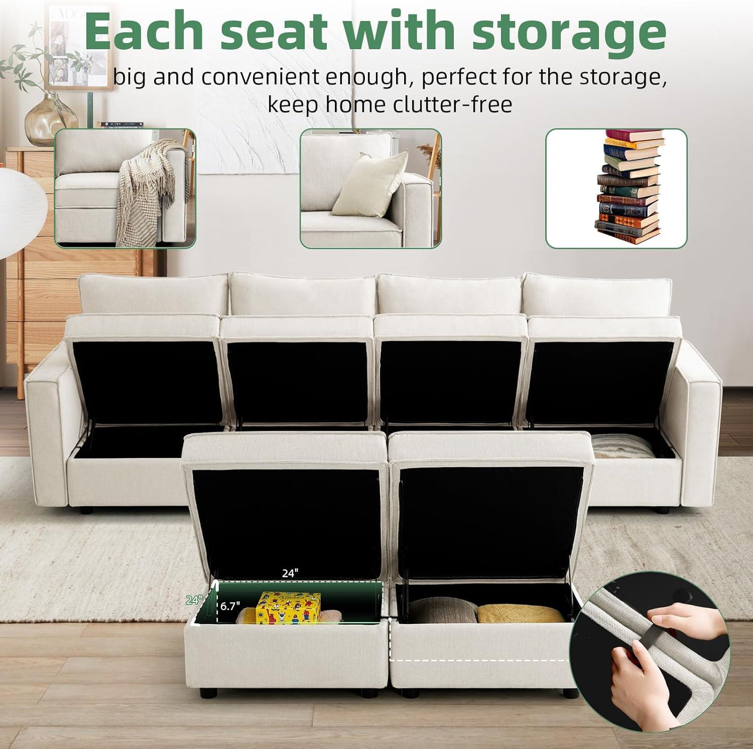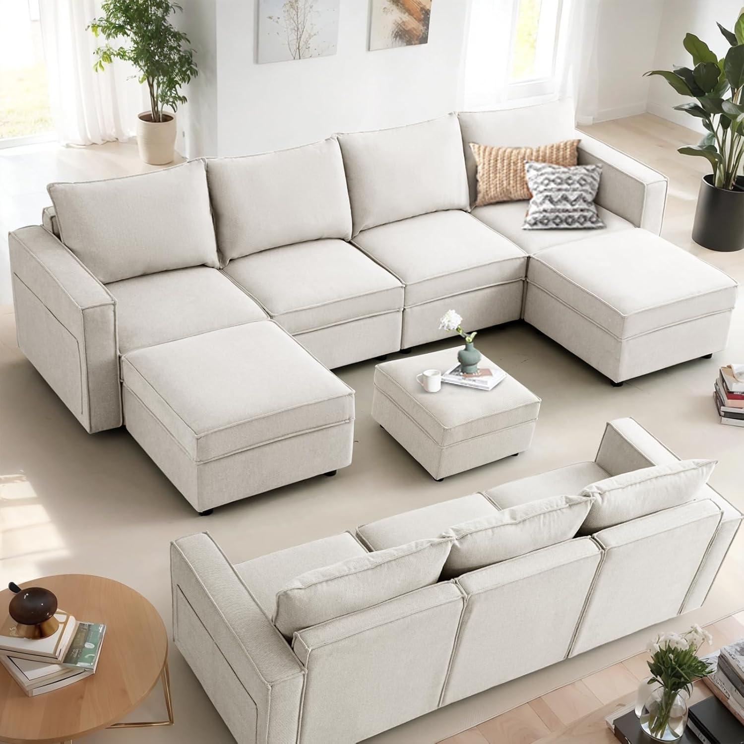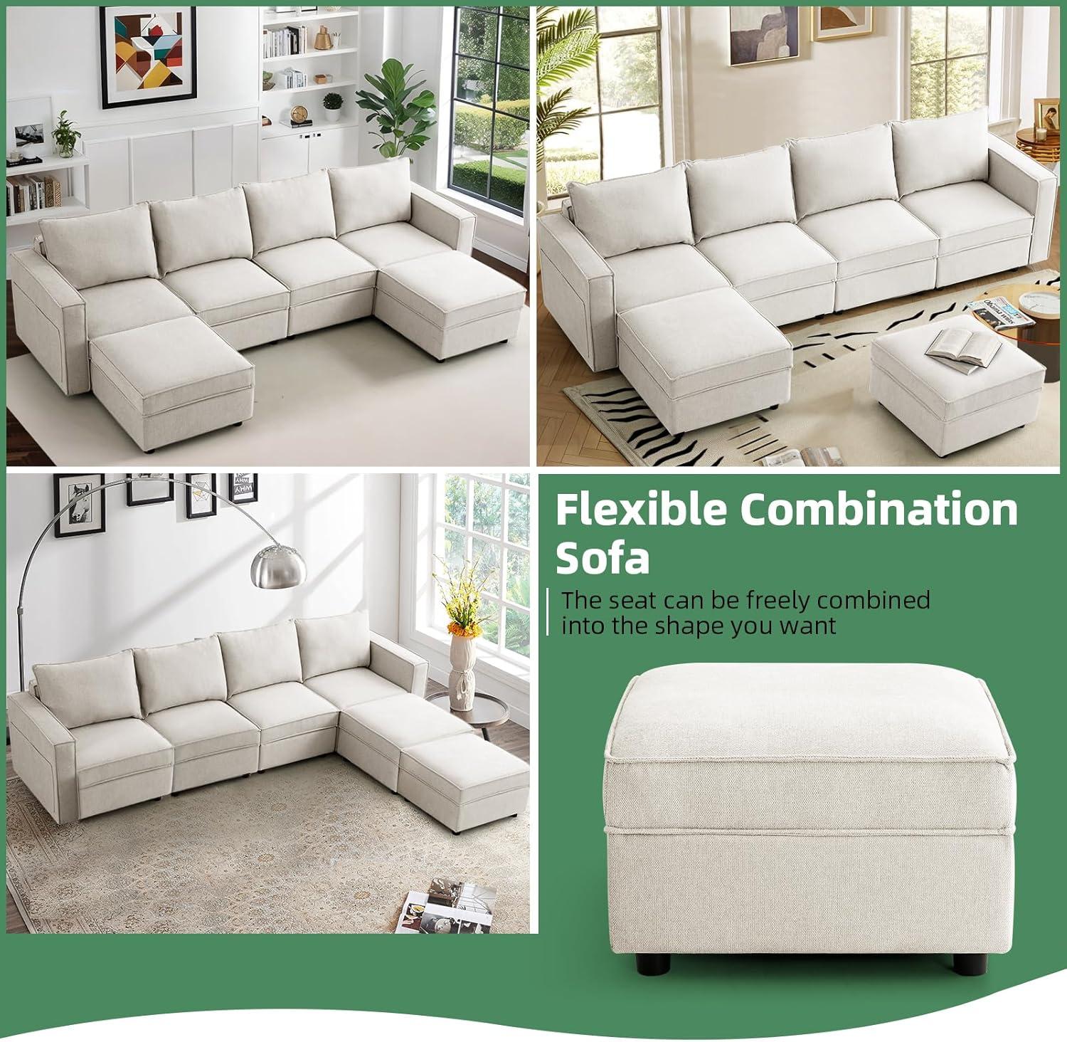 From the moment we saw this modular sectional, its versatility stood out. The U-shaped design allows for multiple configurations, easily adapting to different rooms or occasions. The movable ottoman is a clever touch,serving as a footrest,extra seating,or even a coffee table. What impressed us most was the hidden storage space inside the ottoman-perfect for stowing blankets, toys, or other living room essentials, keeping the space neat and organized. The beige linen upholstery adds a warm, inviting tone while promising durability thru its anti-pilling and colorfast properties. Plus, with removable, washable cushions, maintaining cleanliness is hassle-free.