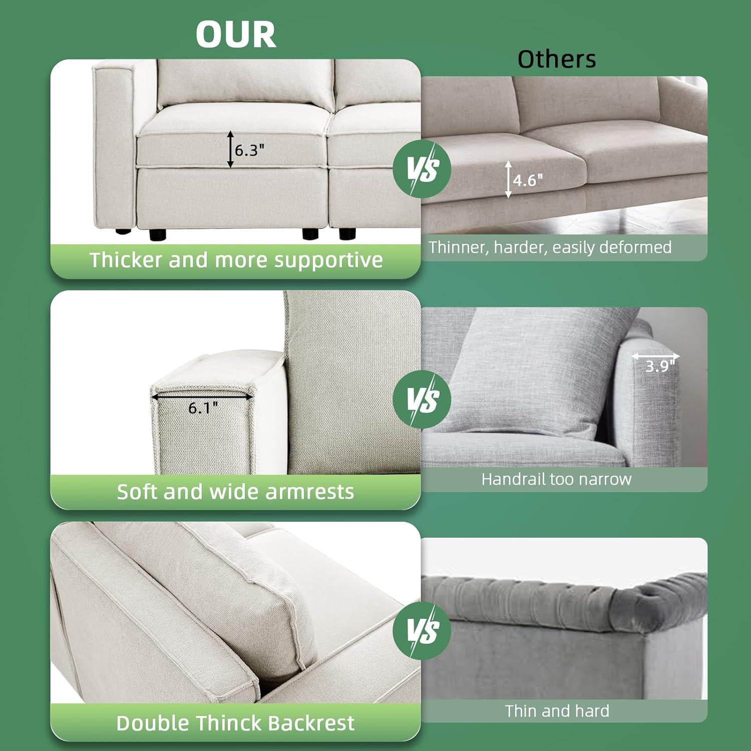 We were promptly impressed by the ergonomic design and versatility of this modular sectional. Its deep seats and thick cushions wrapped in breathable linen fabric offer a perfect blend of plush comfort and durable support. The fabric’s anti-pilling and colorfast properties make it an excellent choice for busy households, especially those with pets. Having removable, washable cushion covers means maintaining cleanliness is hassle-free, and the breathable texture suits all seasons, enhancing our overall lounging experience.