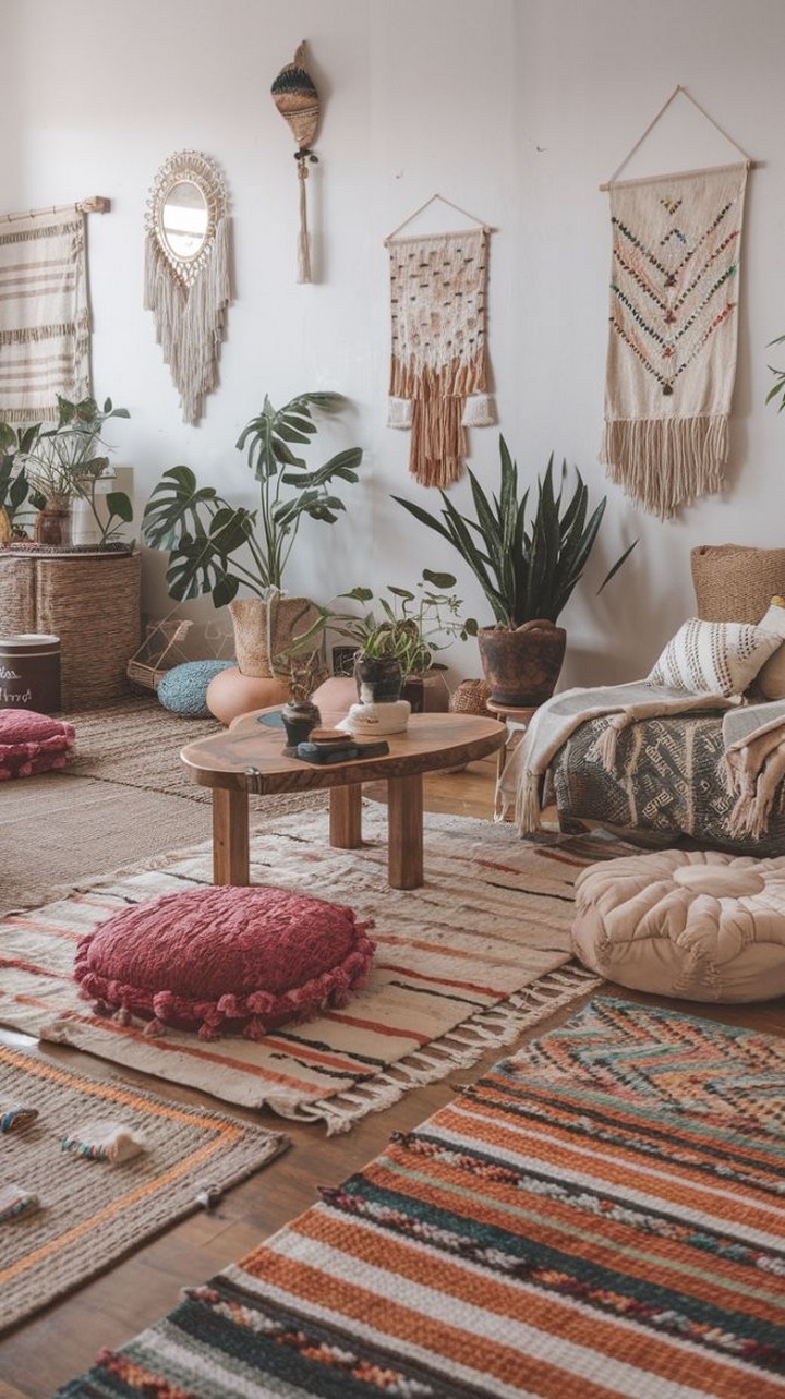 Achieve the distinctly boho layered rug effect by combining budget-friendly picks—try placing a smaller patterned rug diagonally atop a larger natural fiber base like jute or sisal. This technique enriches your floor space with dimension without high costs. Explore sales or curated thrift selections to find the best deals.