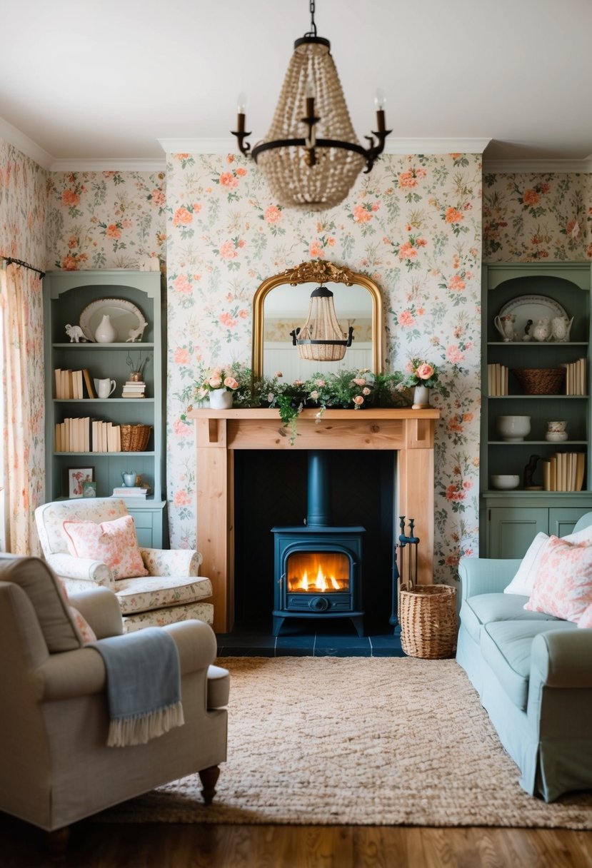 A cozy farmhouse living room with floral wallpaper, vintage furniture, and a crackling fireplace