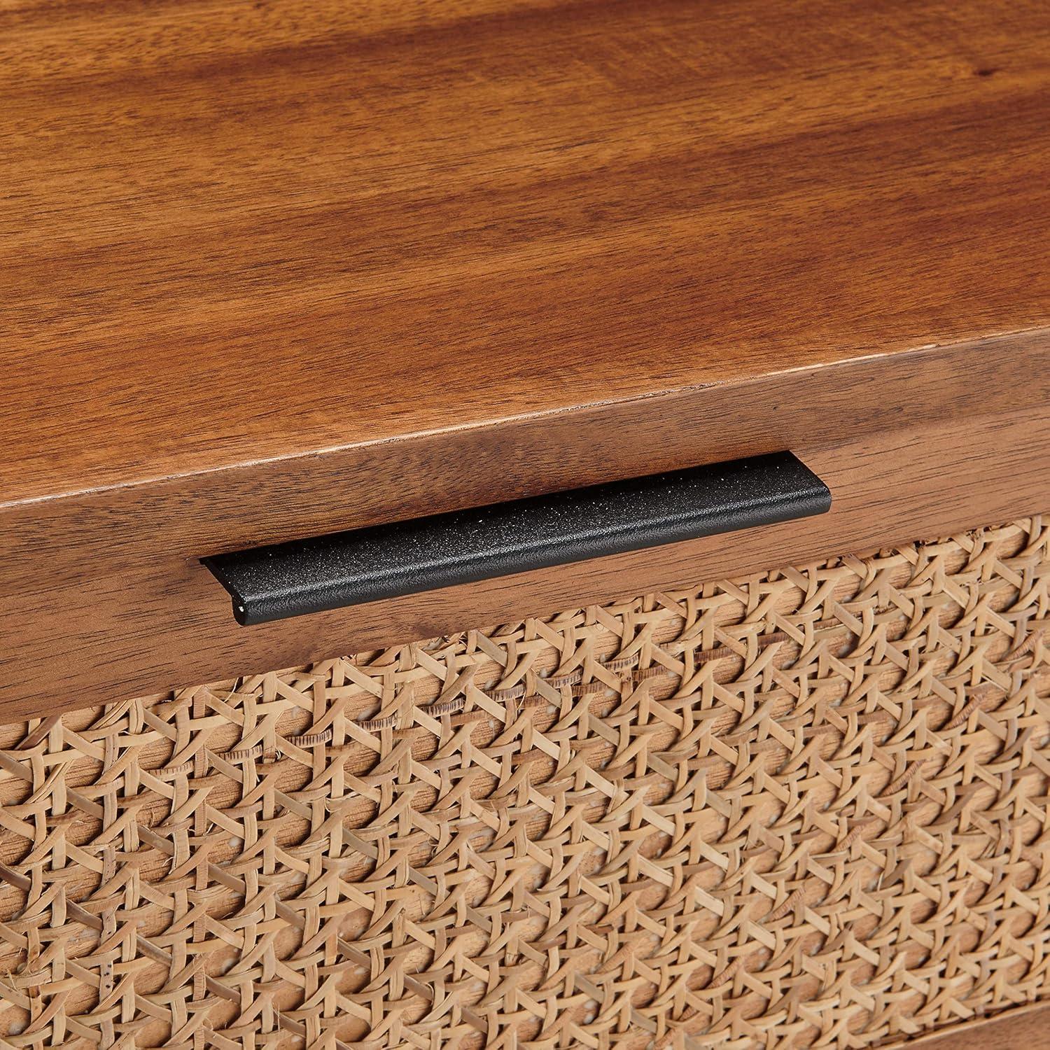 Up close, the handcrafted weaving showcases meticulous attention to detail, creating an appealing texture that adds depth to the room. The drawer glides smoothly on its tracks, and the sturdy frame feels solid without being bulky. This piece perfectly balances rustic charm with practical construction,showing it’s not just about looks but functionality as well.