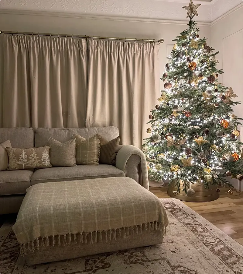 Here, a calm palette of soft creams and taupes on the sofa and curtains acts as the perfect quiet backdrop, allowing a naturally adorned tree to captivate attention. The tree is decorated with oversized pinecones, wooden figurines, and dried florals that feel freshly collected from a woodland walk. Layered textiles, such as fringed throws, plaid cushions, and vintage-inspired rugs, increase the visual and tactile warmth, while soft white lights bring a gentle glow, inviting cozy relaxation.