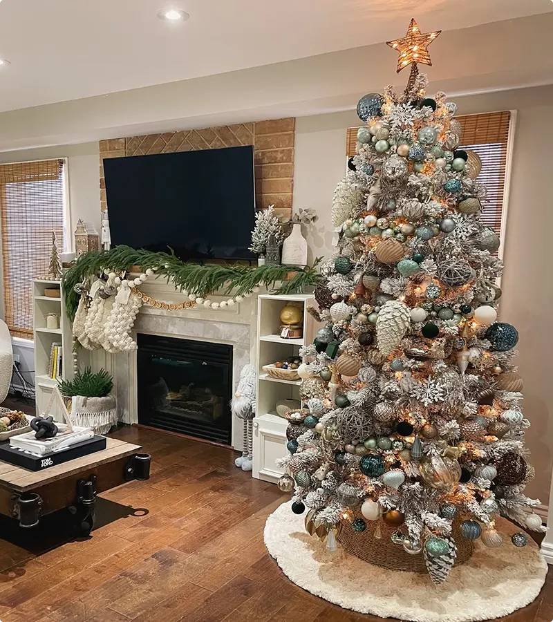 This tree boasts heavily flocked branches that emulate freshly fallen snow, creating a distinctly wintry feel. Departing from traditional reds and greens, the palette introduces soft blues and teal tones paired with copper and beige ornaments, providing a fresh take on rustic style. Elements like a woven basket tree collar, chunky knit stockings, and a brick fireplace enhance the natural and relaxed atmosphere, proving rustic charm can feel modern and serene at once.
