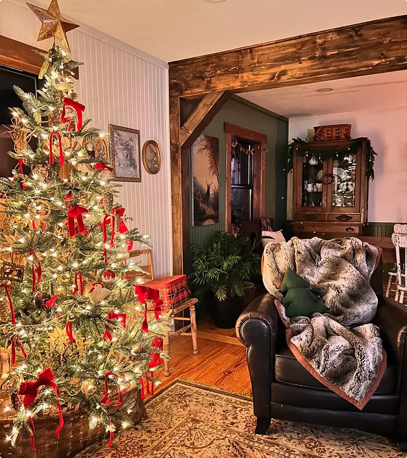 Perfectly embracing rustic lodge vibes, this space highlights natural wood beams paired with a dark leather chair for luxurious comfort. A handcrafted-looking tree showcases long red velvet ribbons in lieu of numerous ornaments, delivering a bold festive accent with minimal effort. Nestling the tree stand inside a woven basket elevates the organic vibe, and the addition of a faux fur throw over the chair beckons you to sit and unwind.