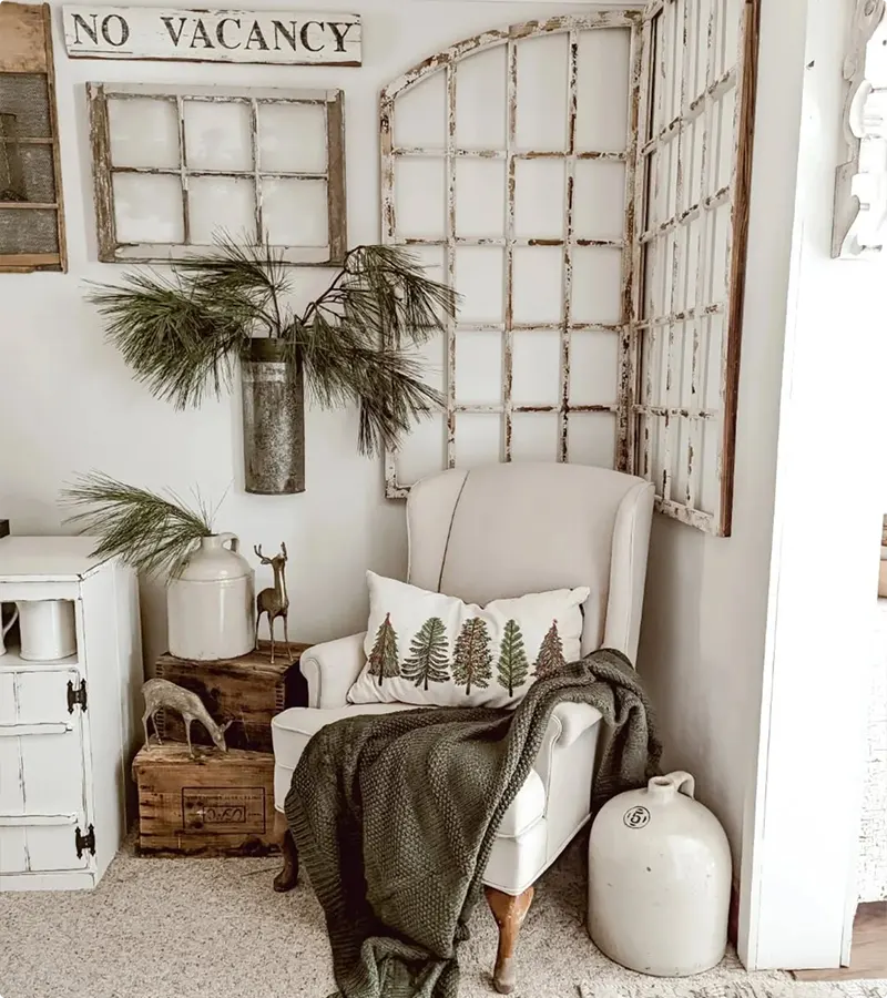 Leaning on softness and antiques, this nook utilizes distressed white window frames as unique wall art to instantly evoke a farmhouse feel. Simple pine branches, likely picked fresh from the yard, are displayed in a vintage metal container for an understated holiday touch. Adding stacked wooden crates, brass deer figurines, and a chunky olive green knit throw creates a scene full of texture that invites quiet, cozy moments.