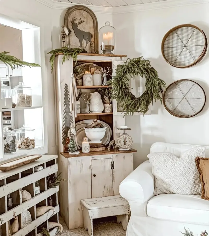 This scene highlights the charm of found objects cleverly incorporated with holiday greenery. A distressed farmhouse hutch forms the backdrop for an evergreen wreath on the door and casually draped sprigs across the top. The mostly white pottery inside the hutch amplifies the fresh green hues. Farm implements like antique sifter screens add interesting texture and subtle industrial warmth—perfect for an authentic, timeless rustic look.