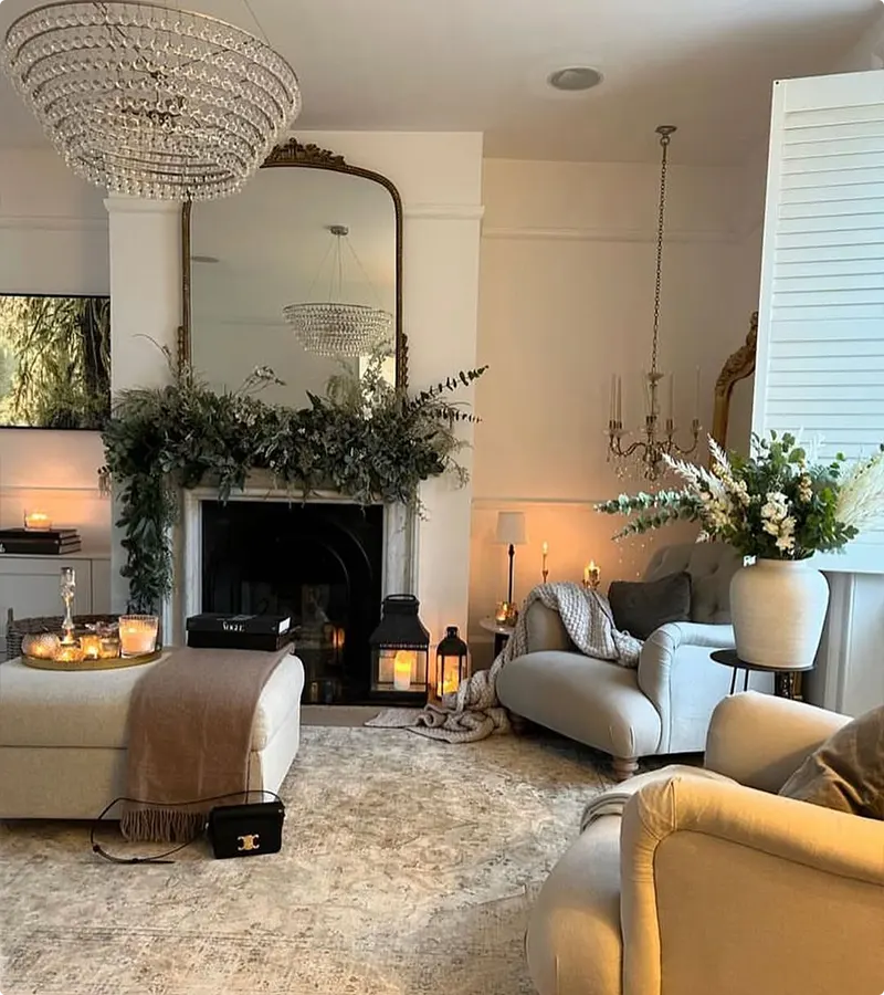 A soft, muted palette of creams, whites, and dusty greens lends sophistication while maintaining a natural rustic vibe. The key element is the subtle dusty olive and grey-green eucalyptus garland that harmonizes beautifully with the grand crystal chandelier and vintage mirror. Black accents like lanterns and books provide grounding contrast, while plentiful candlelight cranks up the intimate coziness that defines rustic holiday spaces.