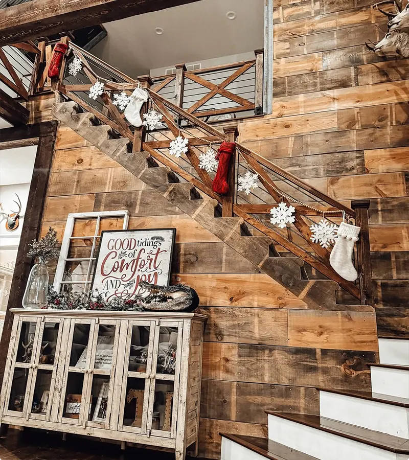 Wood-Clad Staircase Accented with Snowflakes and Knitted Stockings