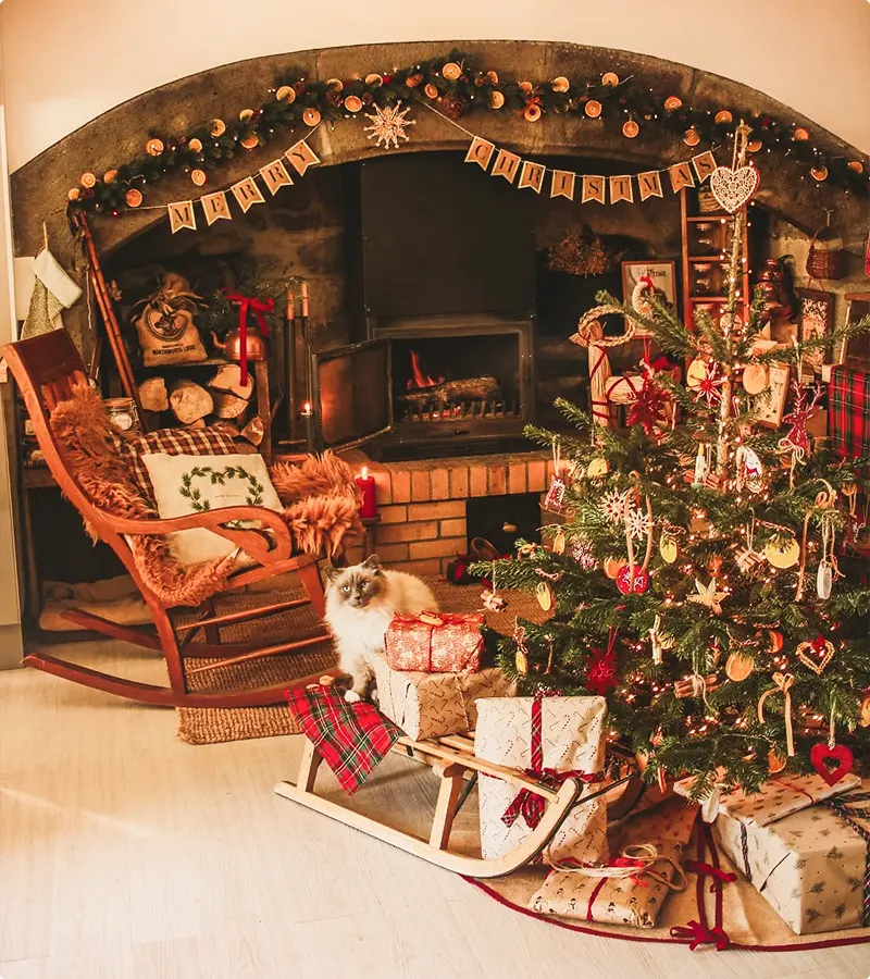 This cozy setting resembles a scene from a classic holiday film, emphasizing tactile warmth and rustic charm. A stone fireplace with a brick surround creates a perfect centerpiece, complemented by a garland made of dried citrus slices and fresh greenery, which adds color, scent, and vintage flair. Opting for a wooden sleigh stacker instead of a tree skirt to hold gifts was an ingenious, functional touch, while a rocking chair draped in sheepskin adds an inviting layer of comfort.