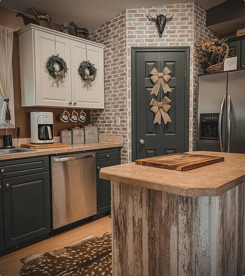 Keeping seasonal decorating minimal yet effective, the kitchen features petite evergreen wreaths tied with twine or ribbon adorning cabinet doors, adding a subtle festive touch without crowding practical spaces like the coffee station. Rustic motifs already present in faux-brick backsplashes and weathered island finishes further reinforce the warmth, while a creative burlap bow replaces a traditional wreath on the door, emphasizing texture over sparkle.