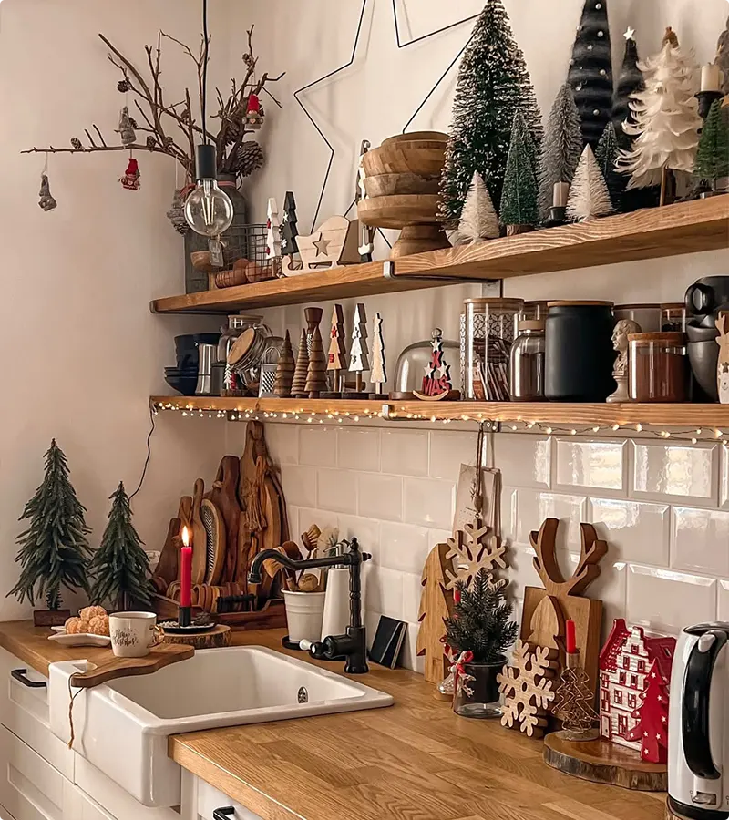 This delightful kitchen display capitalizes on open shelving to showcase a dense arrangement of miniature wooden and bottle brush trees in black, white, and natural wood tones. This charming forest vignette introduces a playful yet rustic energy. Wood slice trivets and snowflake-shaped cutting boards on counters enhance the connection to nature and craftsmanship, harmonizing with warm butcher block surfaces and a farmhouse sink for a cohesive and inviting ambiance.