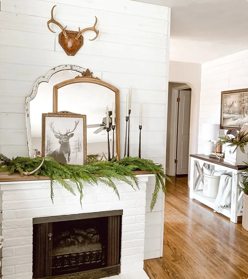 This hearth scene emphasizes refined simplicity, featuring a shiplap wall that brings farmhouse charm. Instead of overcrowding with colorful decorations, the focus stays on a deer wall mount and monochromatic black-and-white artwork. Soft greenery drapes the mantel lightly, adding freshness without clutter. The balance between natural motifs and modern black iron candlesticks and mirror frames gives a stylish, understated edge.