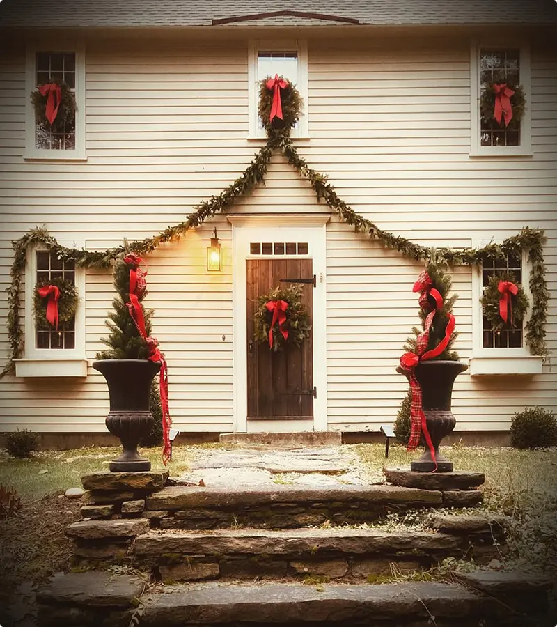 This exterior arrangement exemplifies rustic elegance through moderation. Draped green garlands softly outline the house’s roof and windows, complementing classic evergreen wreaths adorned with bright red bows. Natural stone steps and traditional urns filled with tiny fir trees round out this timeless and inviting holiday scene, blending seamlessly with the home’s historic clapboard facade.