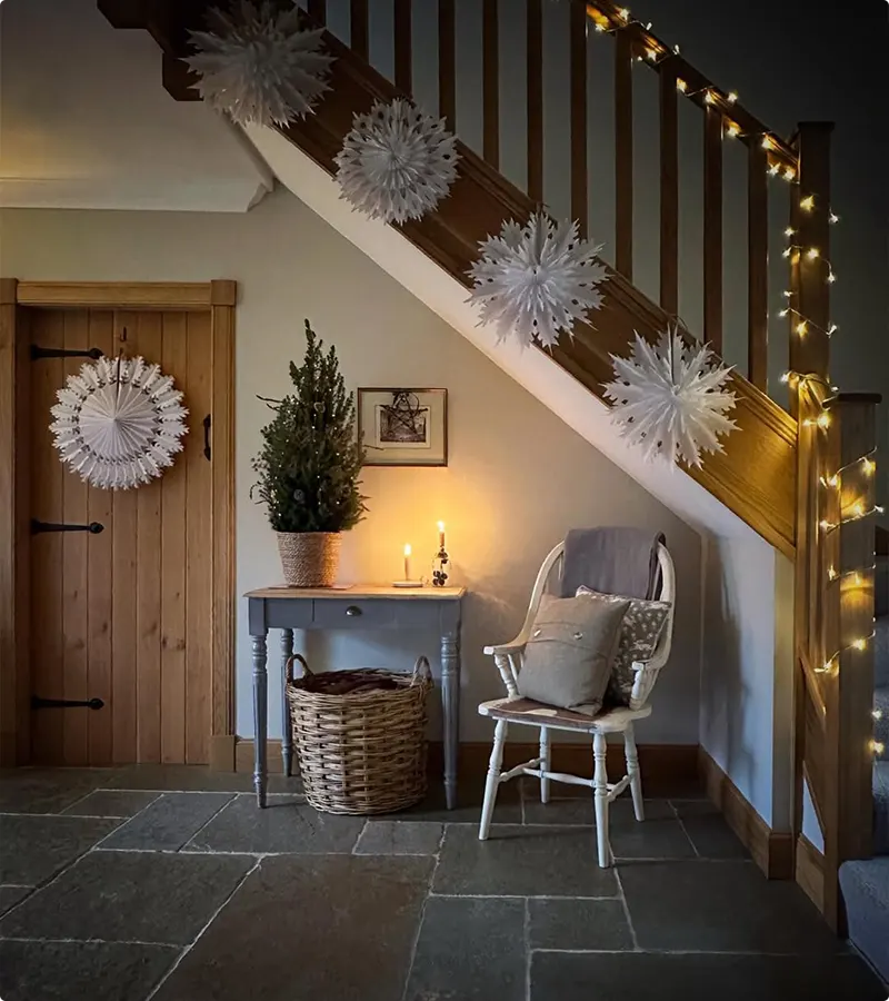 This entryway proves that minimal adornments can make an enchanting statement. Oversized white paper snowflakes dangling along the staircase rail complement the warm wood tones perfectly, giving a handcrafted, cozy impression. Soft neutral cushions, a potted evergreen, and a large woven basket fill the space with subtle texture. Fairy lights gently twisted along the banister complete the warm, magical glow.