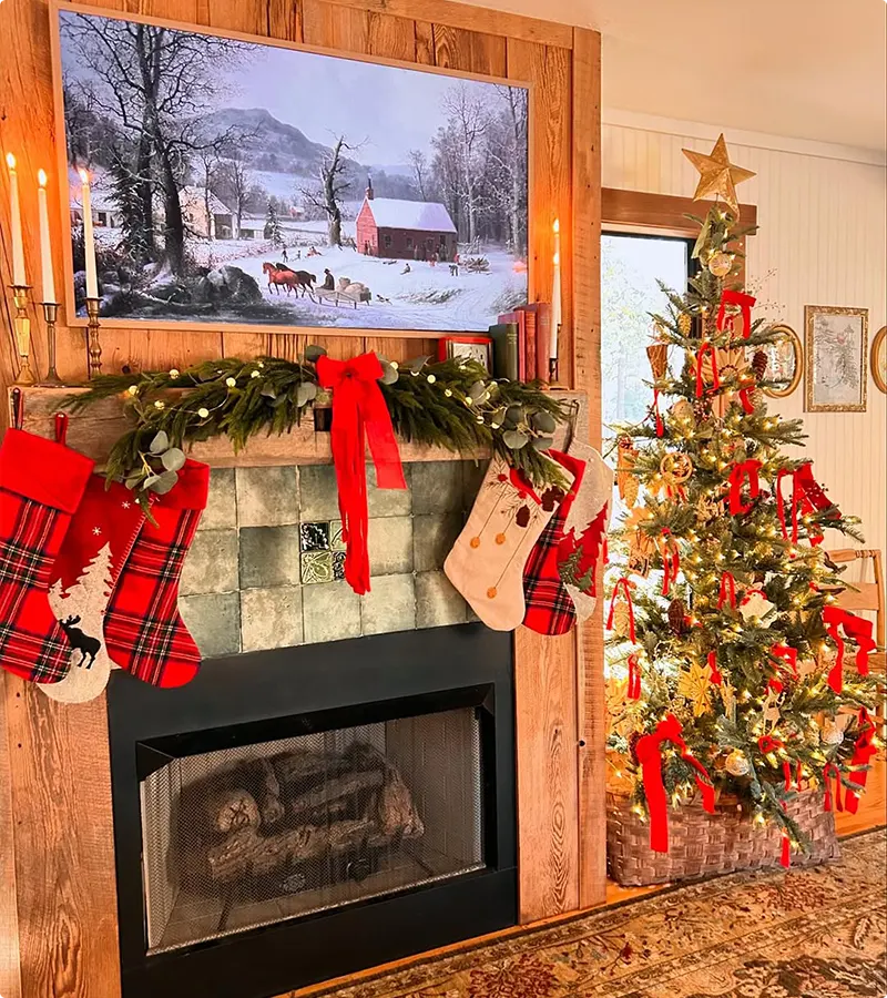 Fireplace with Plaid Stockings and Rustic Wood Paneling