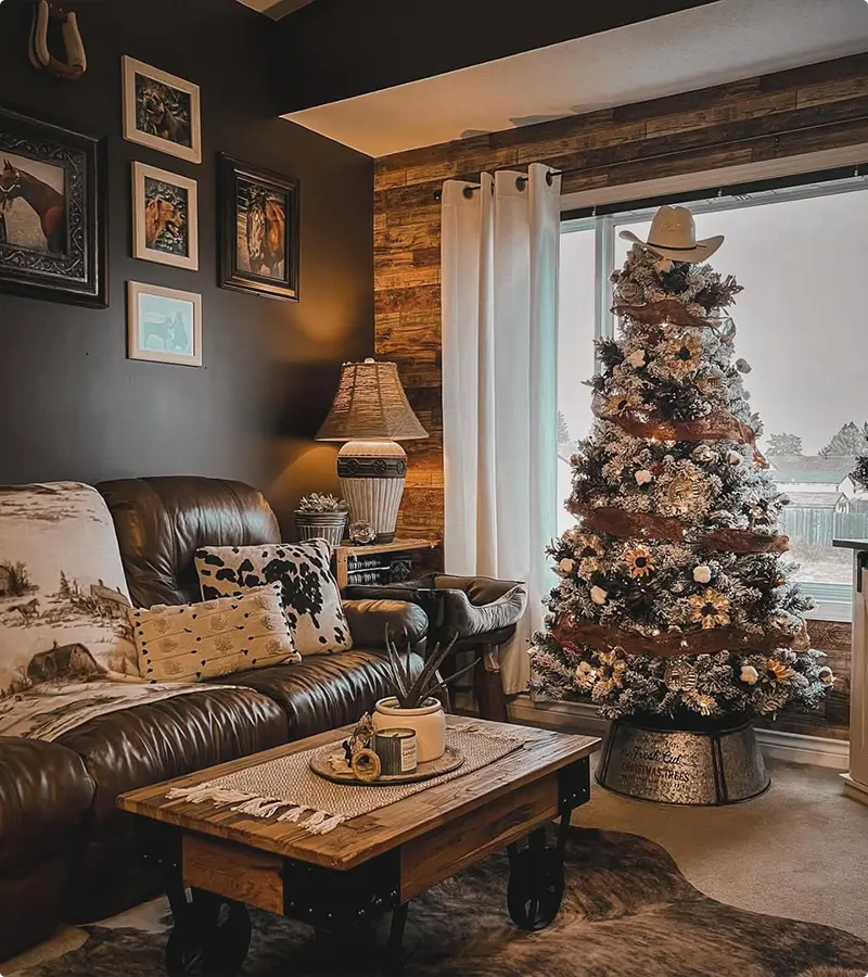 Combining rustic warmth with western ruggedness, this snow-dusted tree features copper and burnt orange ribbons that bring warmth to the space. A rustic galvanized metal feed trough serves as an innovative tree collar, complemented by a playful cowboy hat tree topper. Surrounding elements like shiplap walls, leather furniture, and cowhide rugs enhance the ranch-style ambiance, achieving a cozy, individualistic rustic aesthetic.