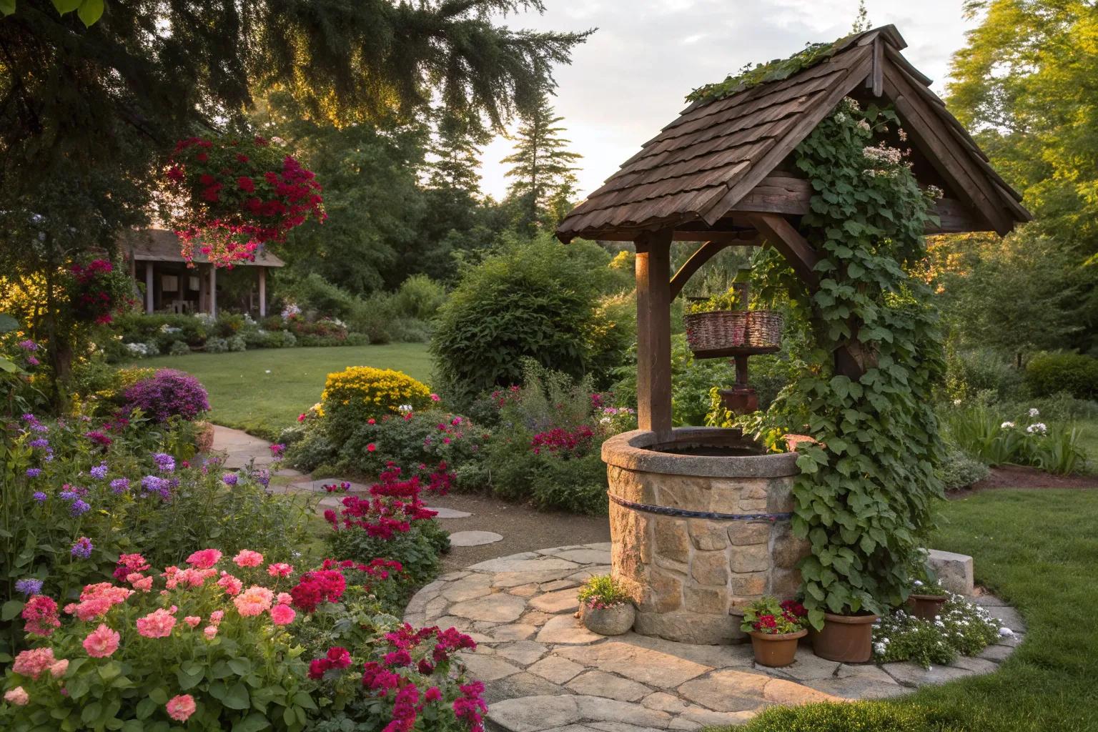 Design a welcoming approach with a carefully crafted stone or gravel path that guides visitors toward your wishing well. This element provides structure and focus while enhancing safety and accessibility within your garden.
