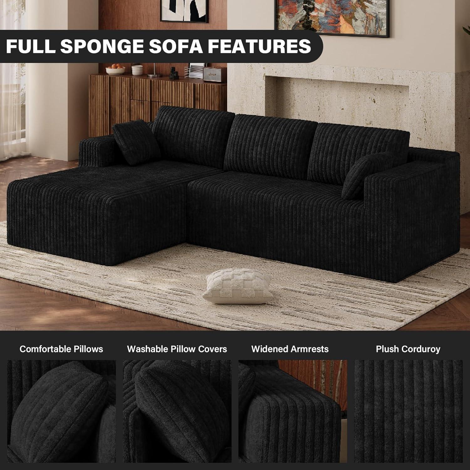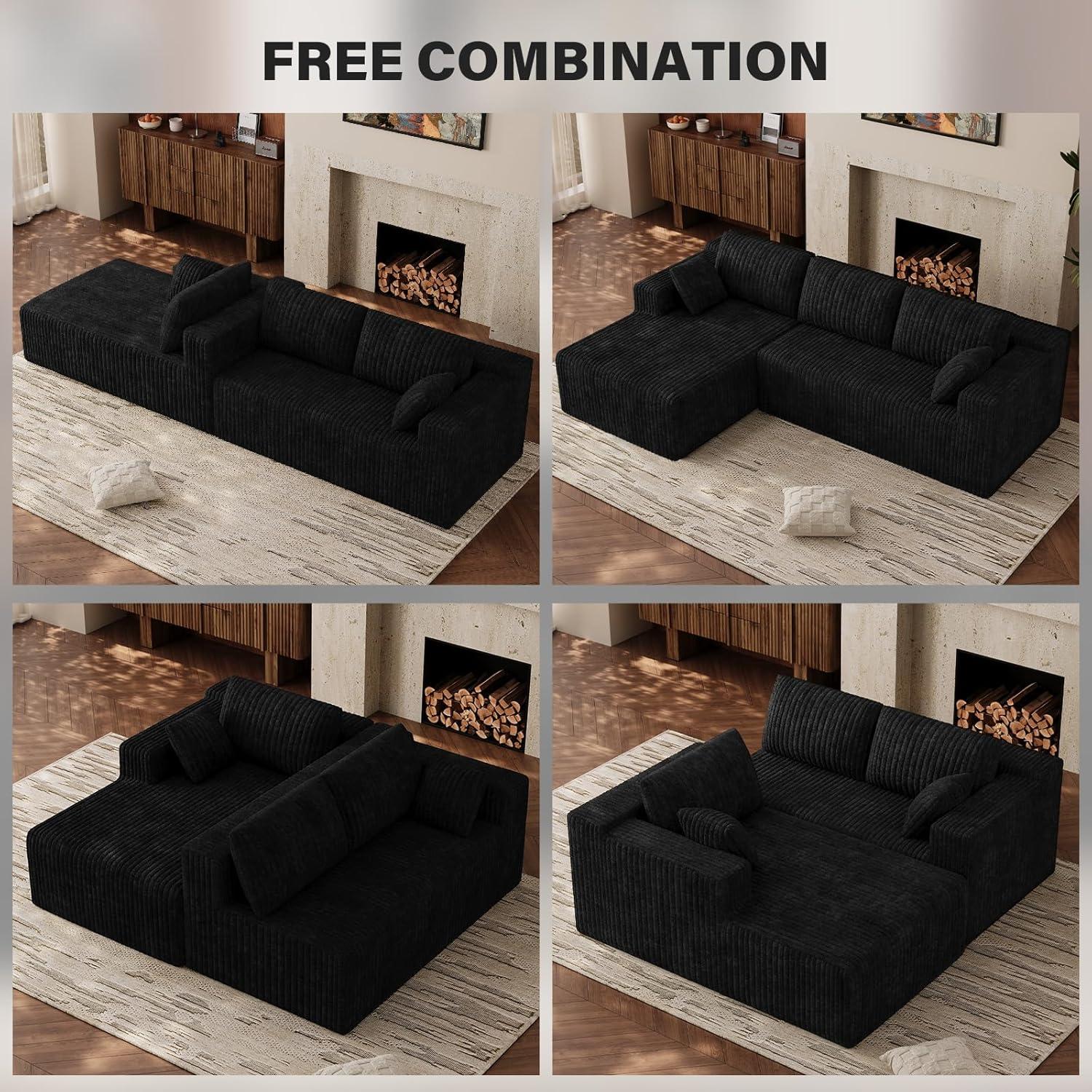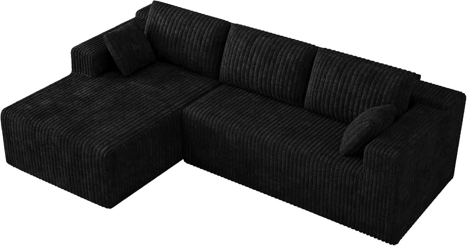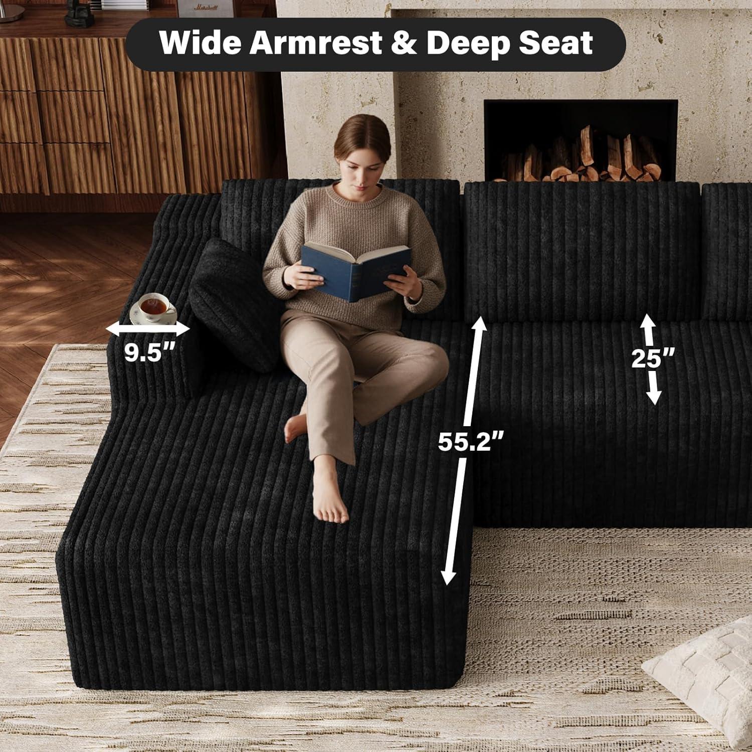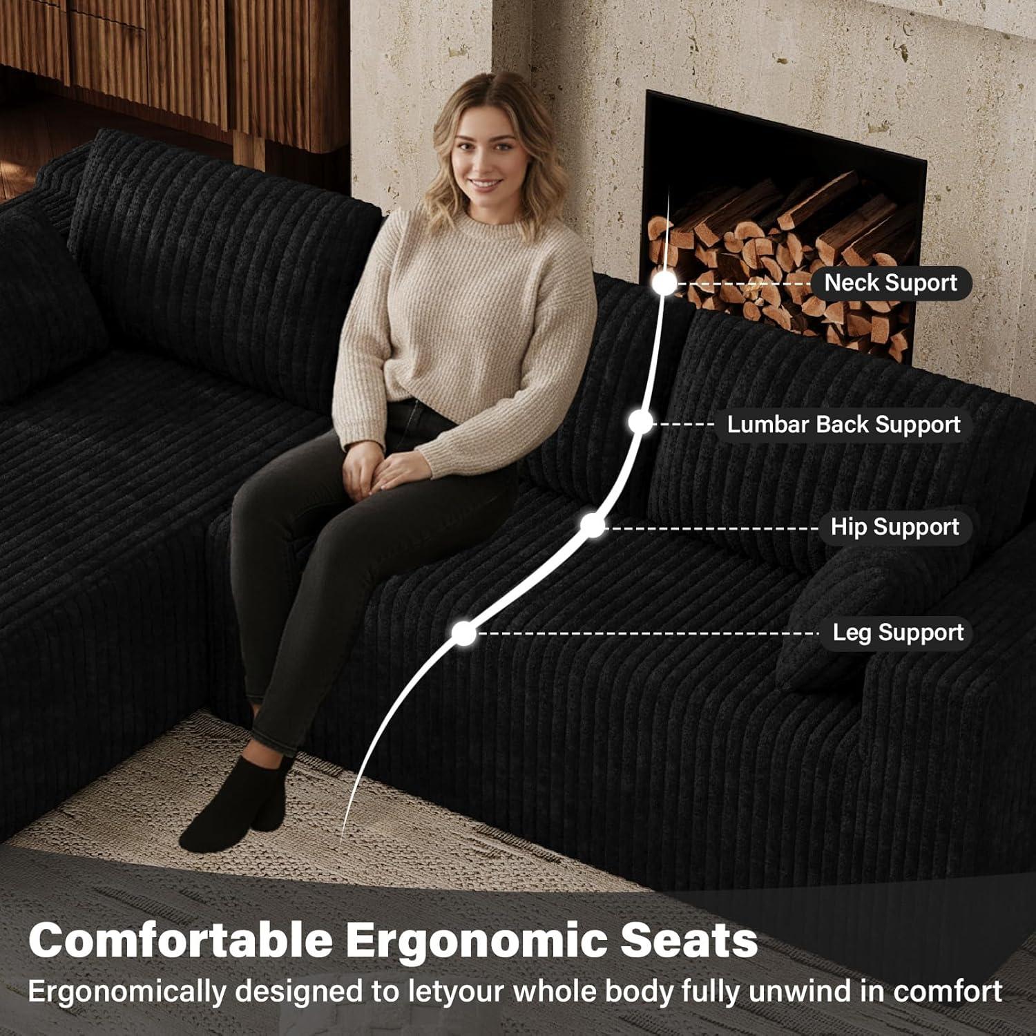 Sunlight skimming the ribbed corduroy throws a soft sheen across the surface, and when you drop your hand onto the cushion it sinks with a slow, pillowy give. The Comfy Cloud Couch 103-inch modular L-shaped sectional arrives as a low, broad presence — more like a lounge that commands the middle of the room than a customary sofa. The left-facing chaise stretches out long enough that you notice how the piece changes sightlines and circulation as you walk past. Up close the fabric feels velvety and warm, the seat depths invite you to settle in, and the overall visual weight somehow anchors the space without looking fussy.