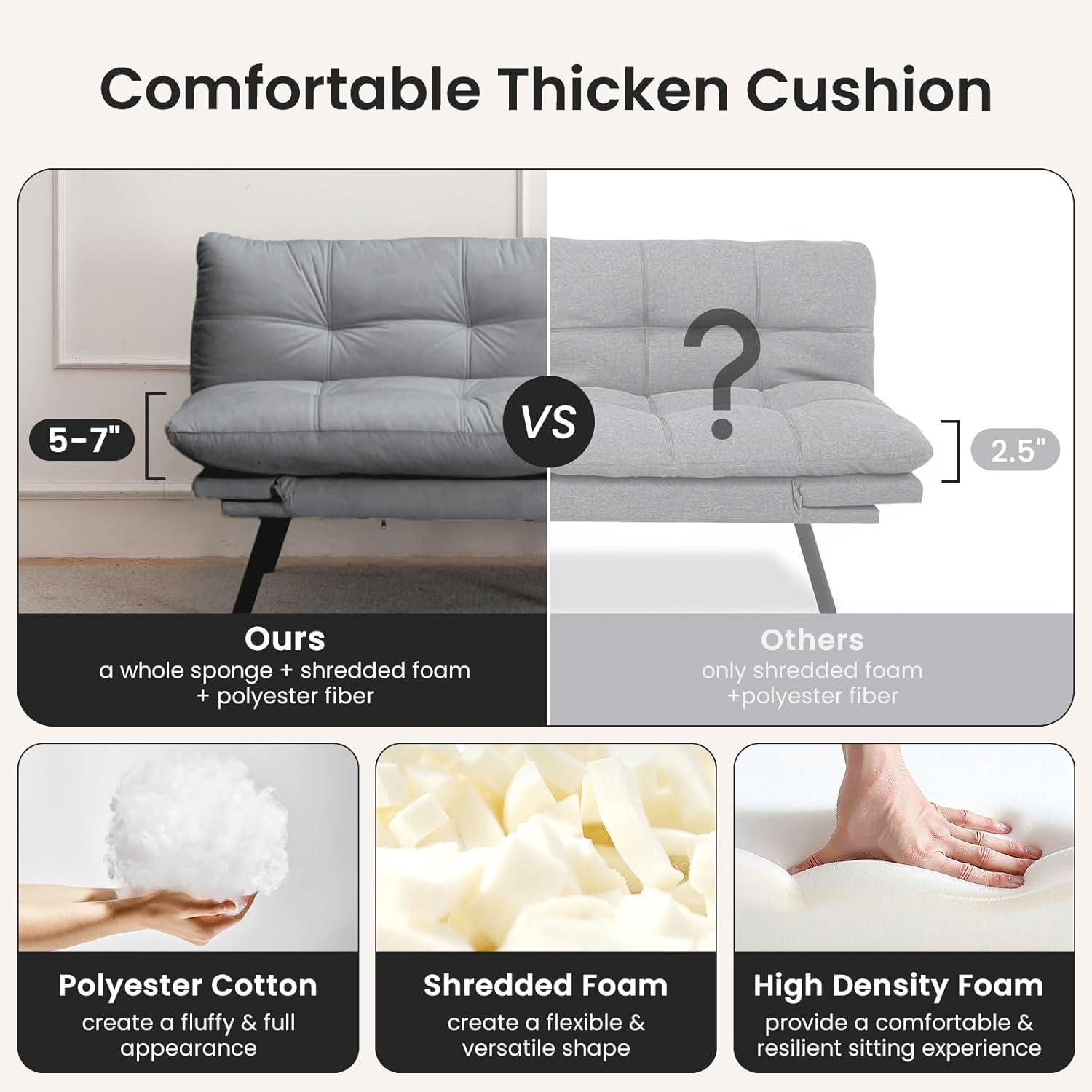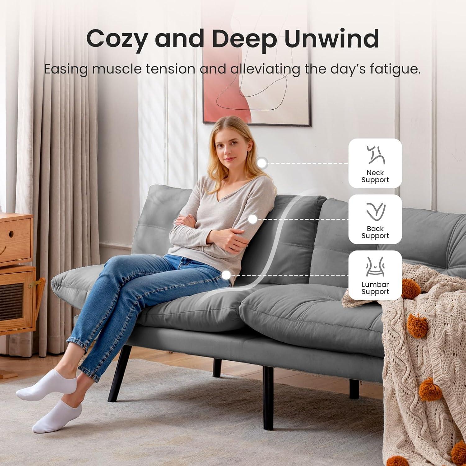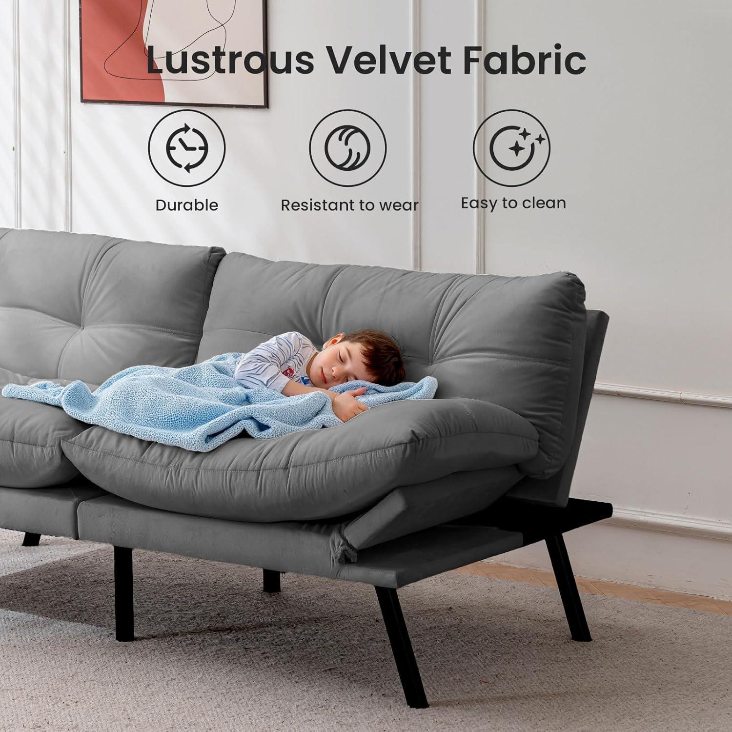 Luxuriously soft velvet upholstery that’s both breathable and skin-friendly, creating a cloud-like comfort. The futon’s compact size, while great for small spaces, might feel a bit snug for taller sleepers when unfolded.
