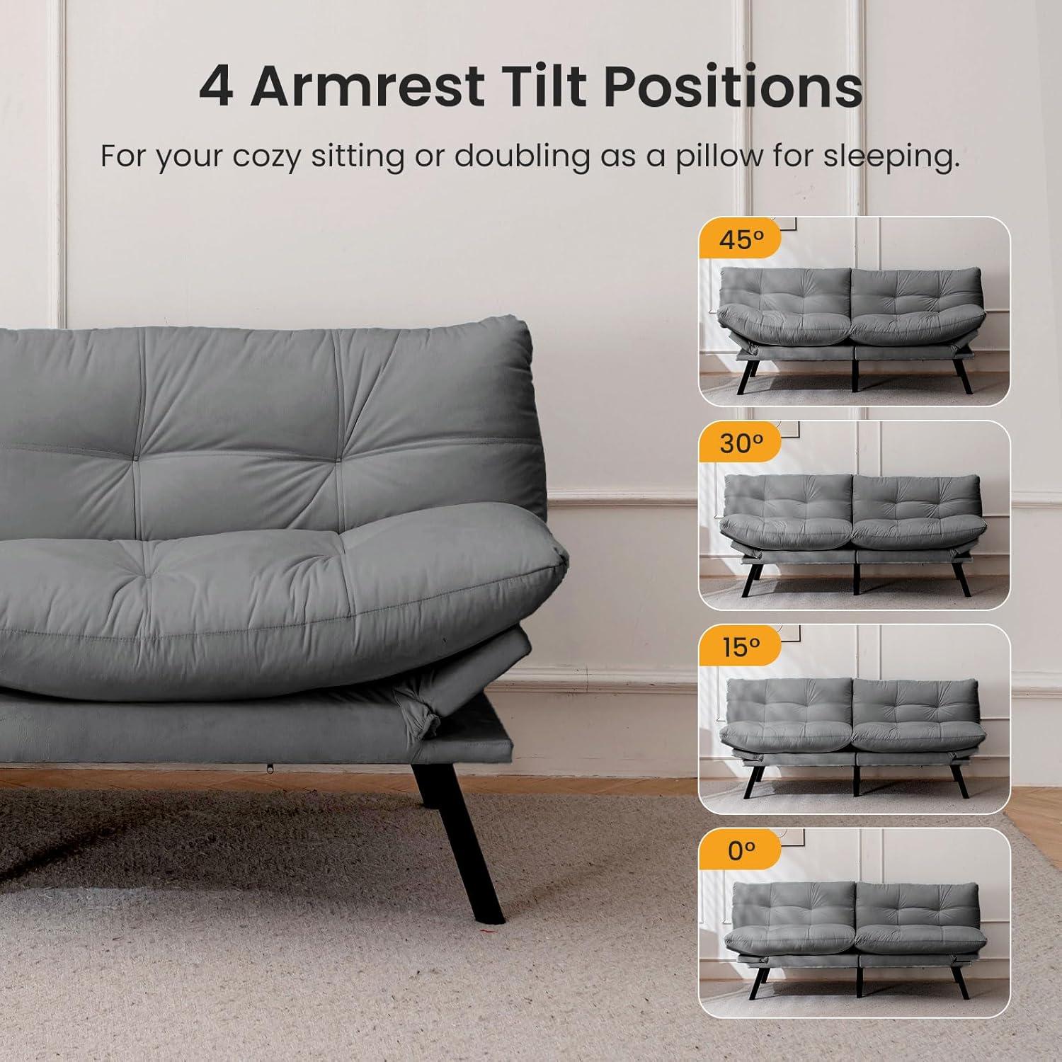 having used this futon extensively in both our living room and bedroom, we’ve found its adaptive design truly impressive. The adjustable backrest offers three comfortable positions-110° for sitting, 150° for lounging, and a fully flat 180° angle for sleeping. This range makes it effortless to switch from casual seating to a cozy nap spot without any hassle. Furthermore, the armrests come with four tilt settings, allowing us to customize our comfort whether we’re relaxing with a book or entertaining guests. The plush, velvet upholstery feels soft yet breathable, ensuring we stay comfortable throughout the day and night.