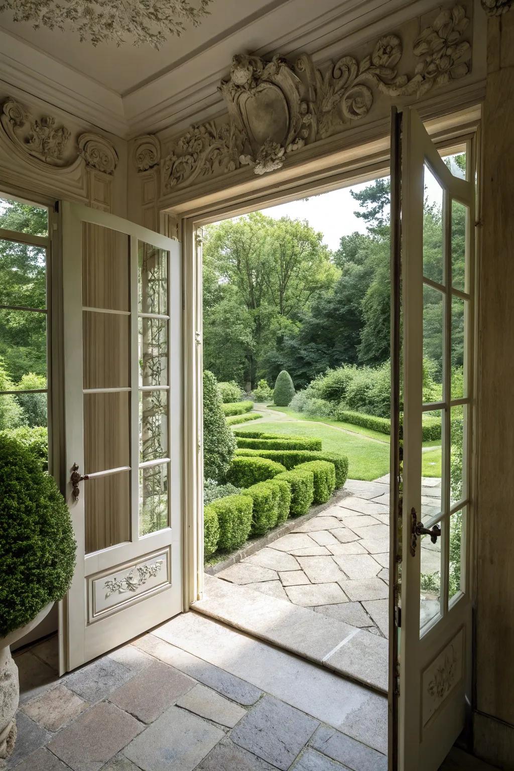 Wooden doors infuse natural warmth and inviting charm.